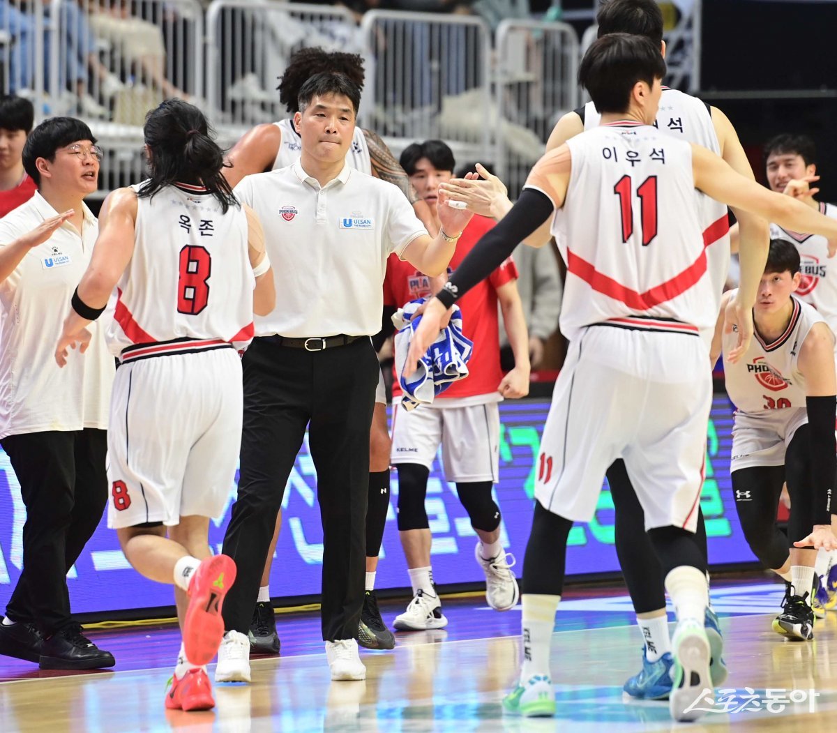 7일 경기도 수원KT소닉붐아레나에서 열린 ‘2023-2024 정관장 프로농구’ 6강 플레이오프 2차전 수원 KT와 울산 현대모비스의 경기에서 현대모비스 조동현 감독이 선수들과 기쁨을 나누고 있다.