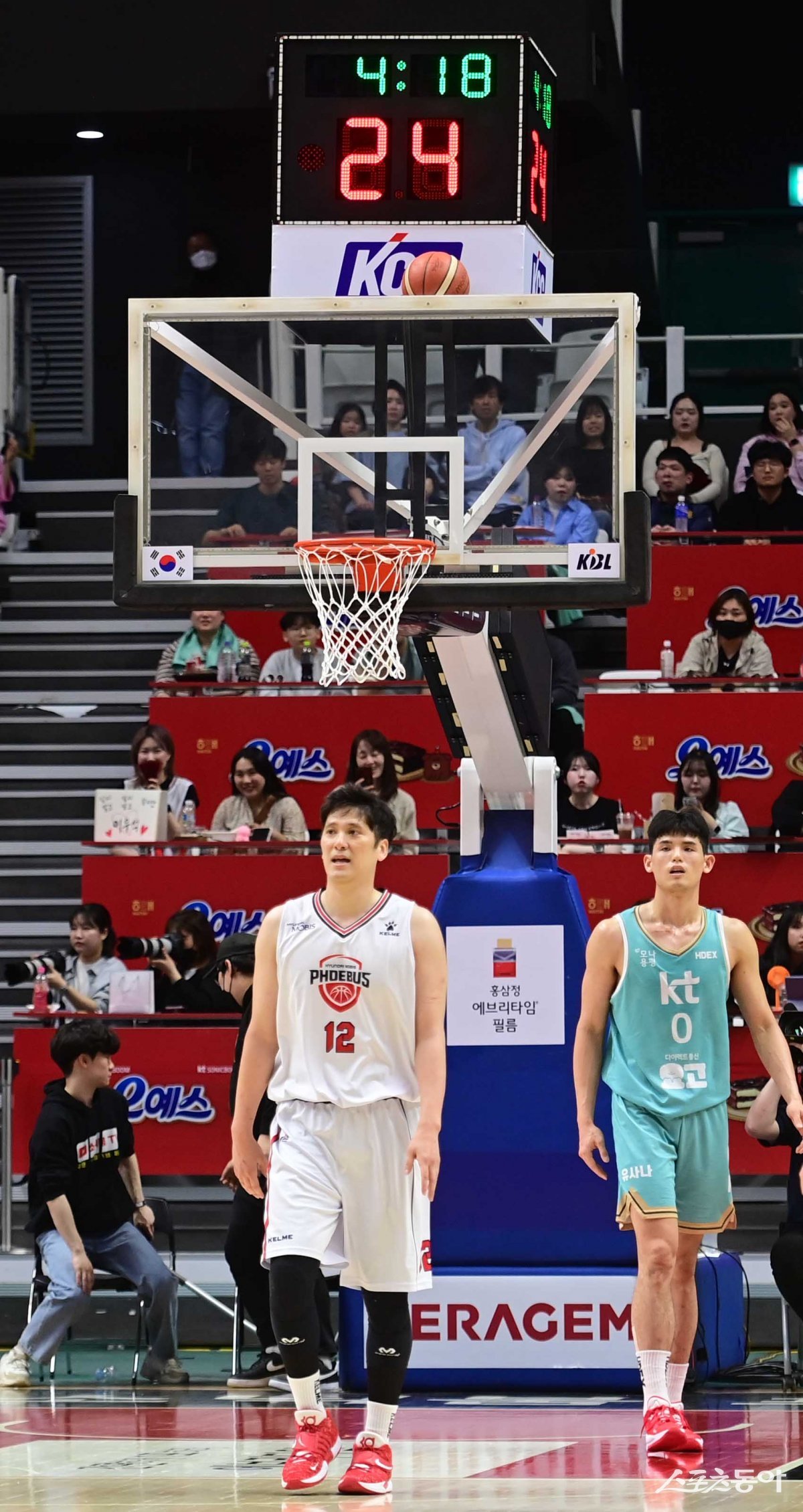 7일 경기도 수원KT소닉붐아레나에서 열린 ‘2023-2024 정관장 프로농구’ 6강 플레이오프 2차전 수원 KT와 울산 현대모비스의 경기에서 볼이 백보드 위에 올라가며 경기가 중단되고 있다.