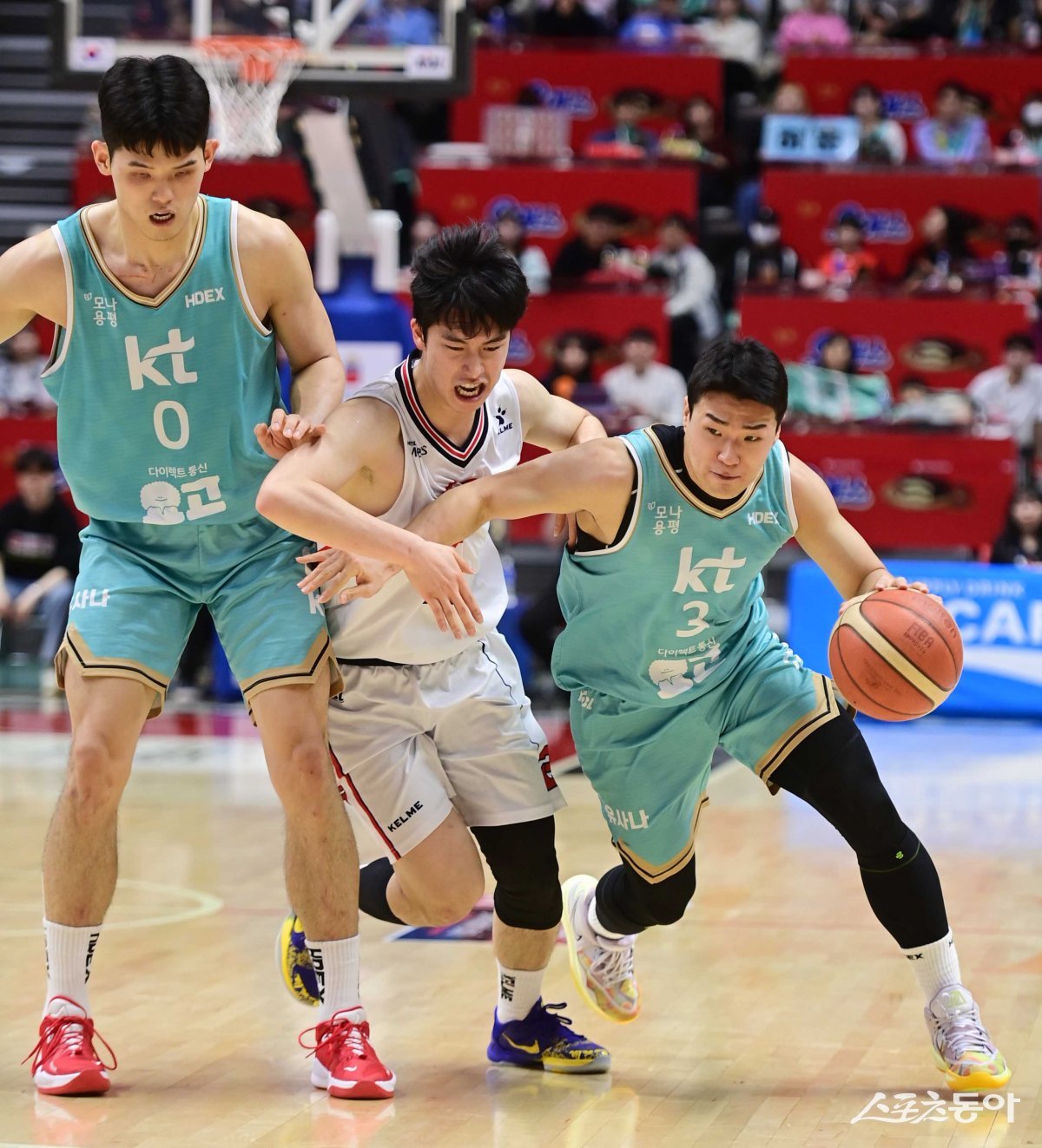 7일 경기도 수원KT소닉붐아레나에서 열린 ‘2023-2024 정관장 프로농구’ 6강 플레이오프 2차전 수원 KT와 울산 현대모비스의 경기에서 KT 정성우가 현대모비스 박무빈의 수비를 뚫고 드리블 돌파를 하고 있다.