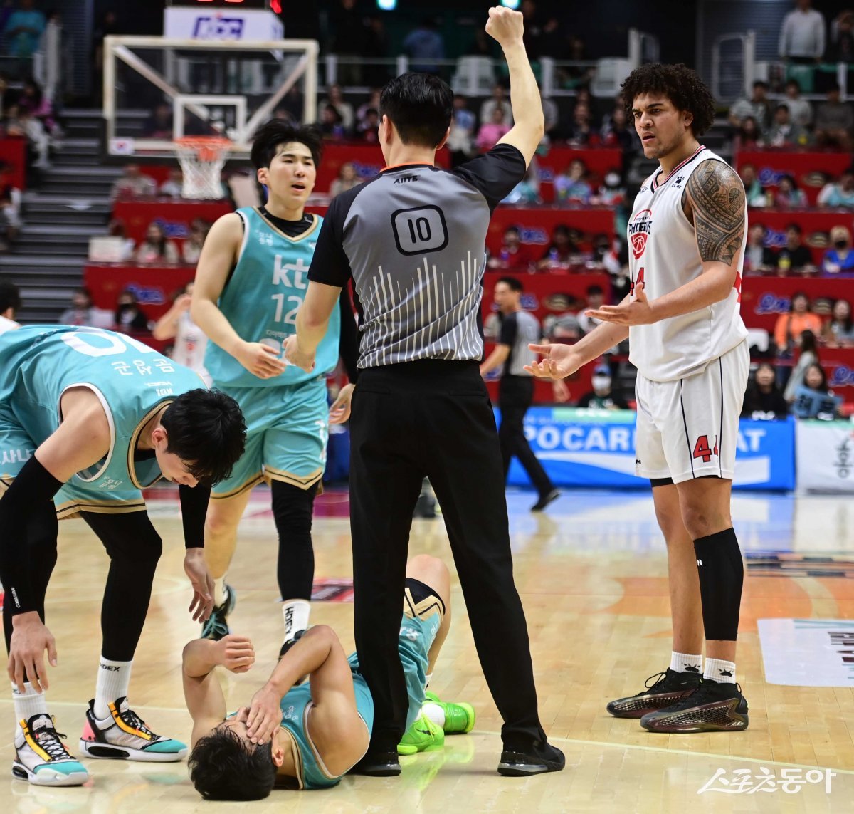7일 경기도 수원KT소닉붐아레나에서 열린 ‘2023-2024 정관장 프로농구’ 6강 플레이오프 2차전 수원 KT와 울산 현대모비스의 경기에서 현대모비스 프림이 KT 허훈에게 U-파울을 한 후 아쉬워하고 있다.