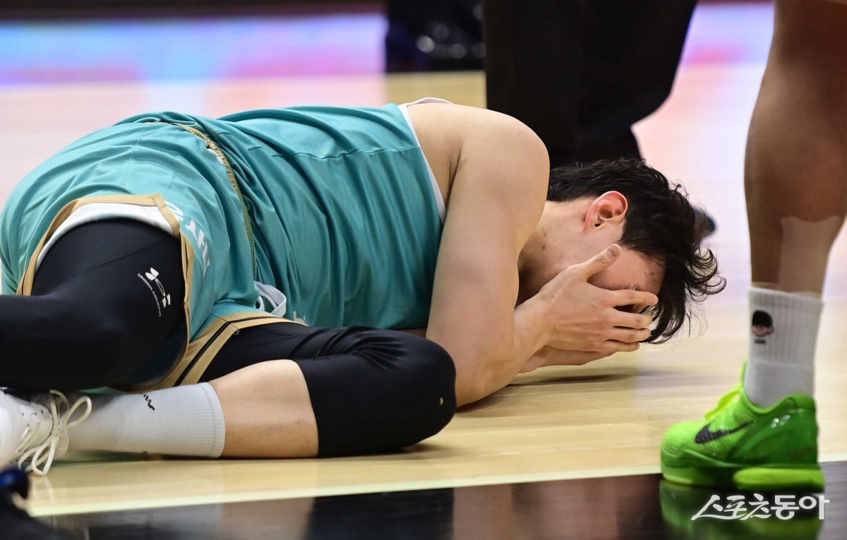 7일 경기도 수원KT소닉붐아레나에서 열린 ‘2023-2024 정관장 프로농구’ 6강 플레이오프 2차전 수원 KT와 울산 현대모비스의 경기에서 KT 한희원이 현대모비스 알루마로부터 반칙을 당한 후 통증을 호소하고 있다.