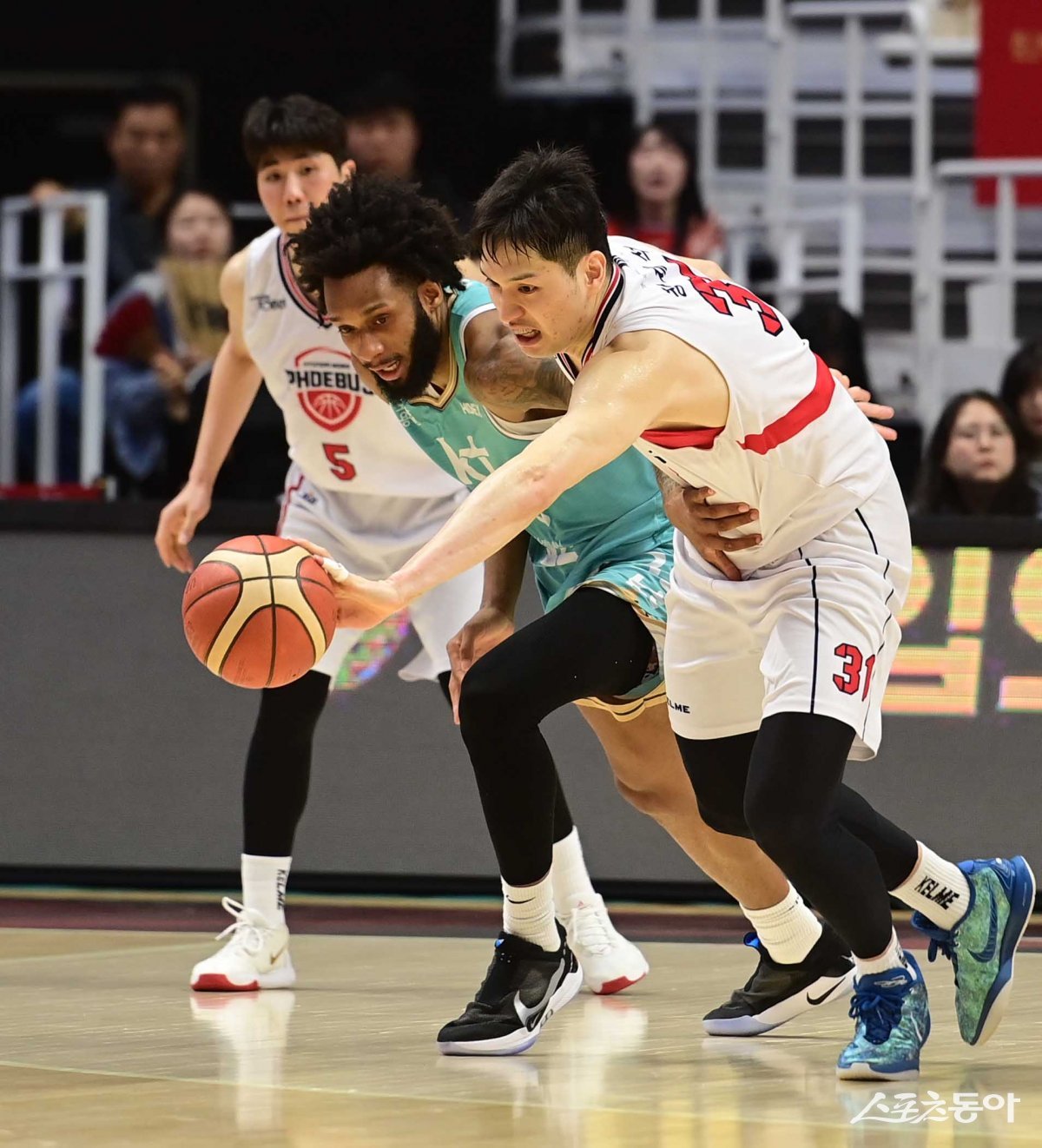 7일 경기도 수원KT소닉붐아레나에서 열린 ‘2023-2024 정관장 프로농구’ 6강 플레이오프 2차전 수원 KT와 울산 현대모비스의 경기에서 현대모비스 장재석이 KT 배스에게 볼을 뺐고 있다.
