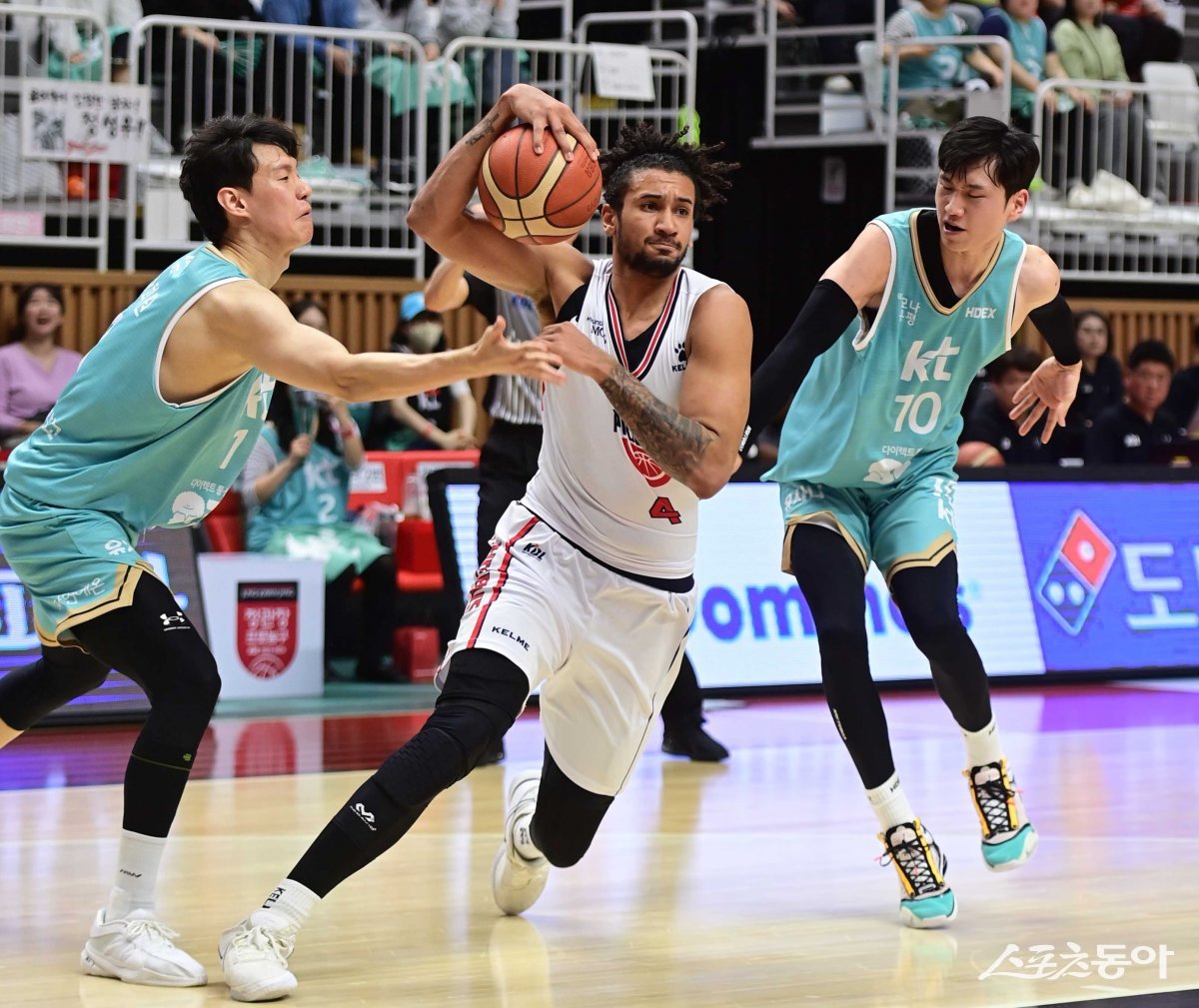 7일 경기도 수원KT소닉붐아레나에서 열린 ‘2023-2024 정관장 프로농구’ 6강 플레이오프 2차전 수원 KT와 울산 현대모비스의 경기에서 현대모비스 알루마가 KT의 수비를 뚫고 드리블 돌파를 하고 있다.