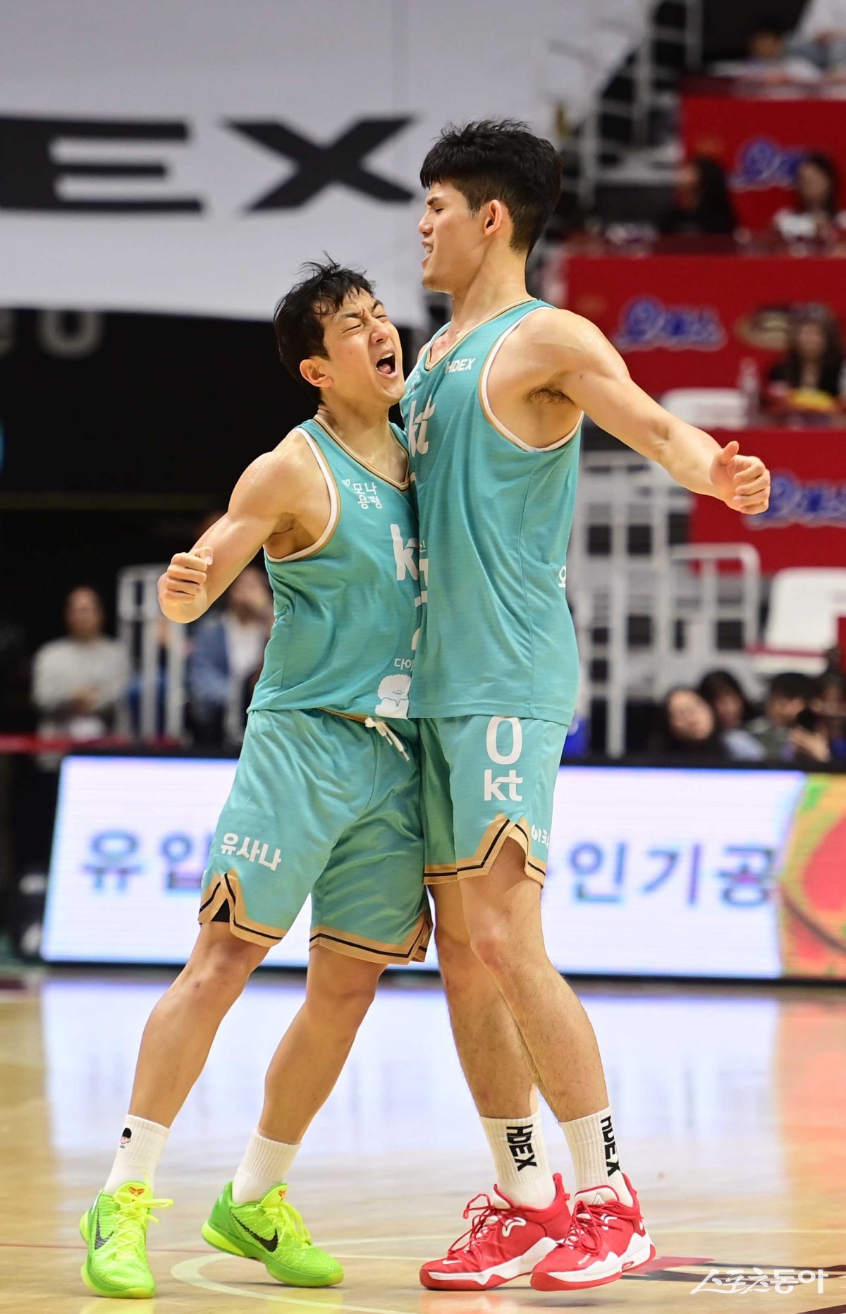 7일 경기도 수원KT소닉붐아레나에서 열린 ‘2023-2024 정관장 프로농구’ 6강 플레이오프 2차전 수원 KT와 울산 현대모비스의 경기에서 득점에 성공한 KT 허훈과 하윤기가 기쁨을 나누고 있다.