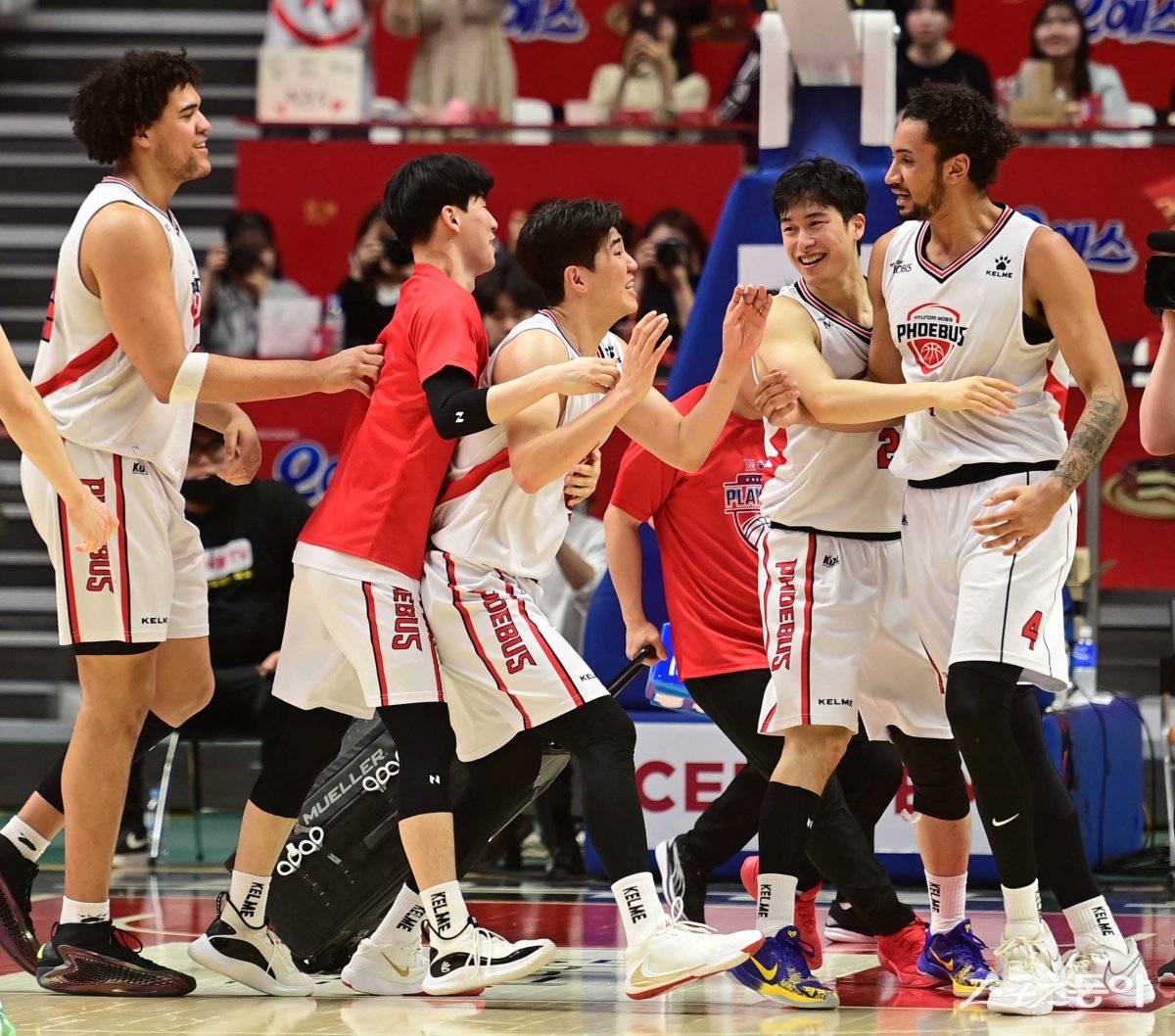 7일 경기도 수원KT소닉붐아레나에서 열린 ‘2023-2024 정관장 프로농구’ 6강 플레이오프 2차전 수원 KT와 울산 현대모비스의 경기에서 79-77로 승리한 현대모비스 김지완, 박무빈, 알루마가 기쁨을 나누고 있다.