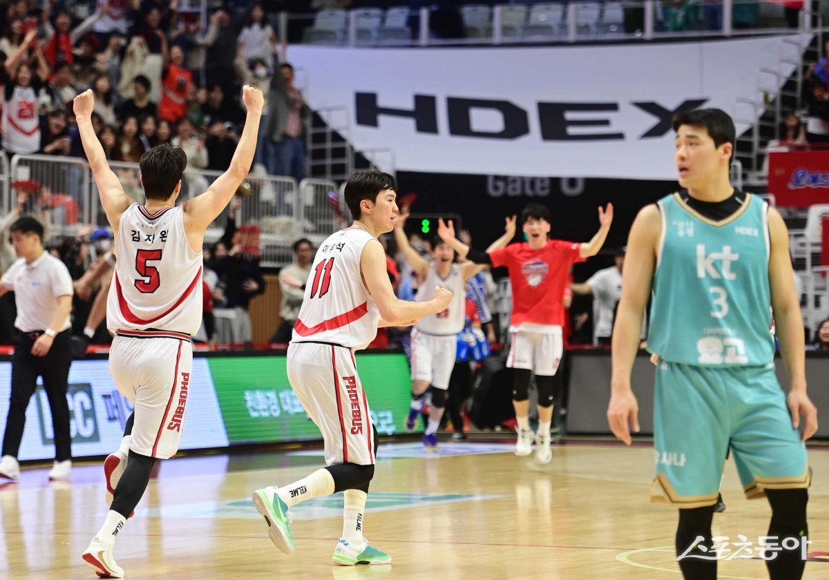 7일 경기도 수원KT소닉붐아레나에서 열린 ‘2023-2024 정관장 프로농구’ 6강 플레이오프 2차전 수원 KT와 울산 현대모비스의 경기에서 79-77로 승리한 현대모비스 이우석이 기뻐하고 있다.