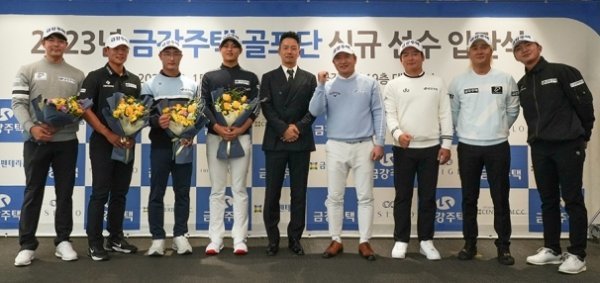 금강주택 프로골프단이 15일 서울 강남구 금강주택 본사에서 신용구, 최영준, 김경민, 한태현 등 신규 선수 4명의 입단식을 열었다. 신용구는 지난해 8월 우성종합건설 오픈에서 우승하는 등 한국프로골프(KPGA) 코리안투어에서 20개 대회에 출전해 4차례 톱10에 들며 상금랭킹 13위(3억3807만원)에 오른 선수다.