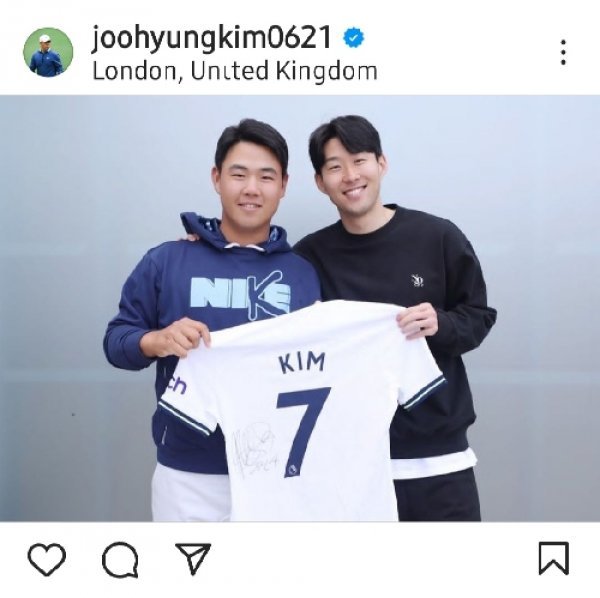 미국프로골프(PGA) 투어에서 2승을 기록한 ‘라이징 스타’ 김주형이 한국 축구의 간판이자 잉글랜드 프리미어리그(EPL) 득점왕 출신인 손흥민(토트넘)과 함께 찍은 사진을 공개했다. 골프만큼 축구에 진심인 김주형이 예고했던 ‘버킷 리스트’는 손흥민과의 만남이었다. 손흥민은 자신의 등번호 7에 ‘KIM’ 이라고 적힌 유니폼을 선물하고 다정하게 포즈를 취했다.