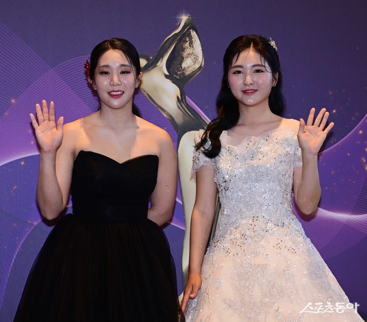 20일 서울 강남구 삼성동 그랜드인터컨티넨탈 서울파르나스에서 열린 ‘2023 KLPGA 대상 시상식’ 포토월에서 임진희와 이예원이 포즈를 취하고 있다.