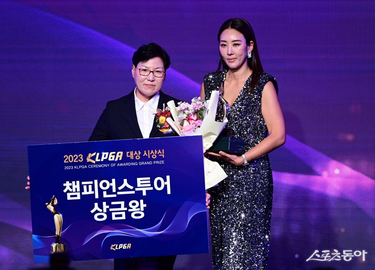 20일 서울 강남구 삼성동 그랜드인터컨티넨탈 서울파르나스에서 열린 ‘2023 KLPGA 대상 시상식’에서 챔피언스투어 상금왕을 수상한 홍진주가 기념 촬영을 하고 있다.