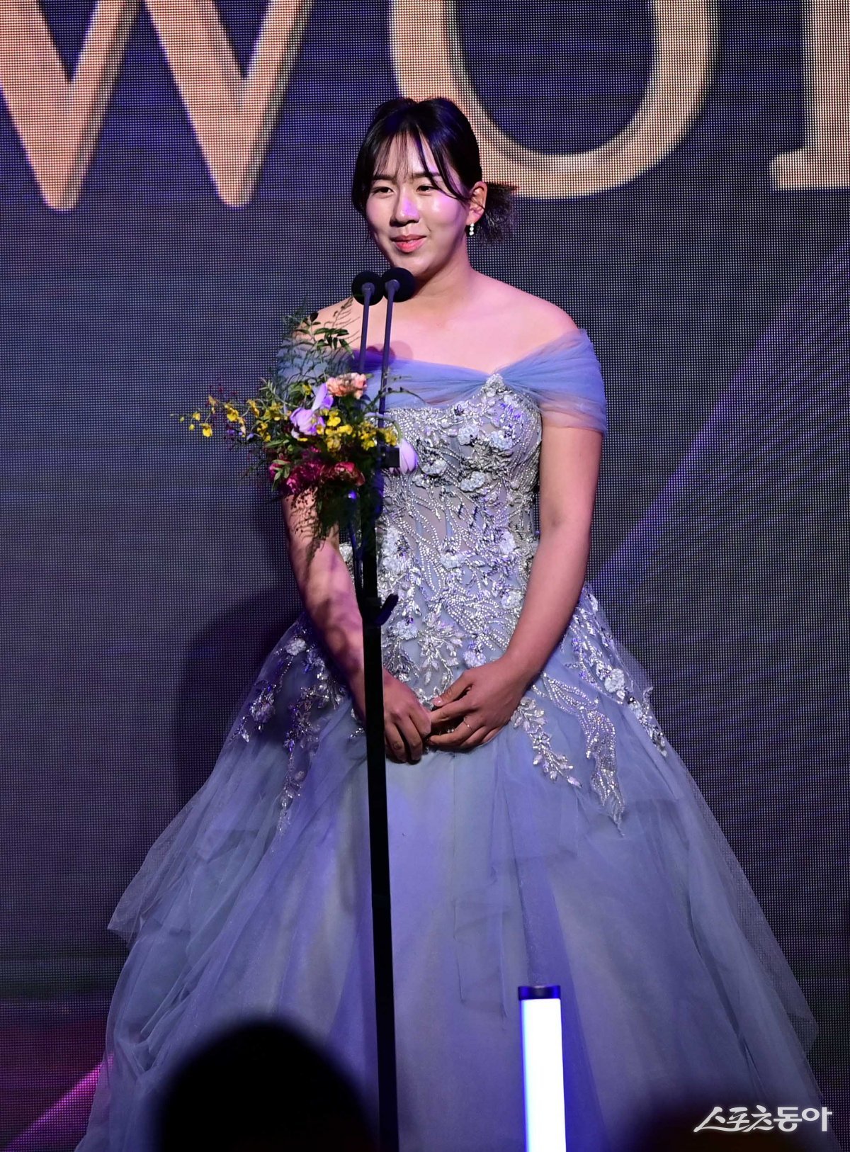 20일 서울 강남구 삼성동 그랜드인터컨티넨탈 서울파르나스에서 열린 ‘2023 KLPGA 대상 시상식’에서 국내특별상 수상자들을 대표해 홍지원이 소감을 말하고 있다.