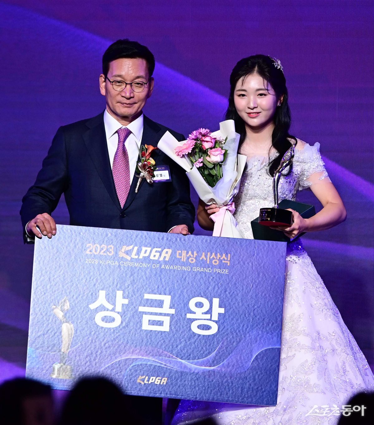 20일 서울 강남구 삼성동 그랜드인터컨티넨탈 서울파르나스에서 열린 ‘2023 KLPGA 대상 시상식’에서 상금왕을 수상한 이예원이 기념 촬영을 하고 있다.