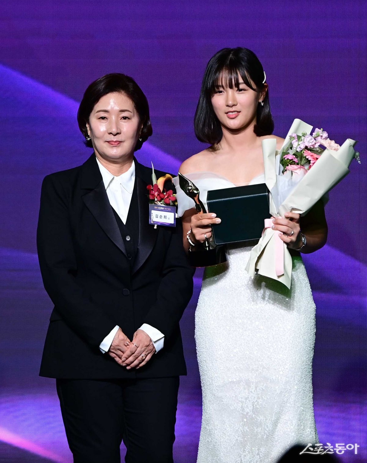 20일 서울 강남구 삼성동 그랜드인터컨티넨탈 서울파르나스에서 열린 ‘2023 KLPGA 대상 시상식’에서 인기상을 수상한 박현경이 기념 촬영을 하고 있다.
