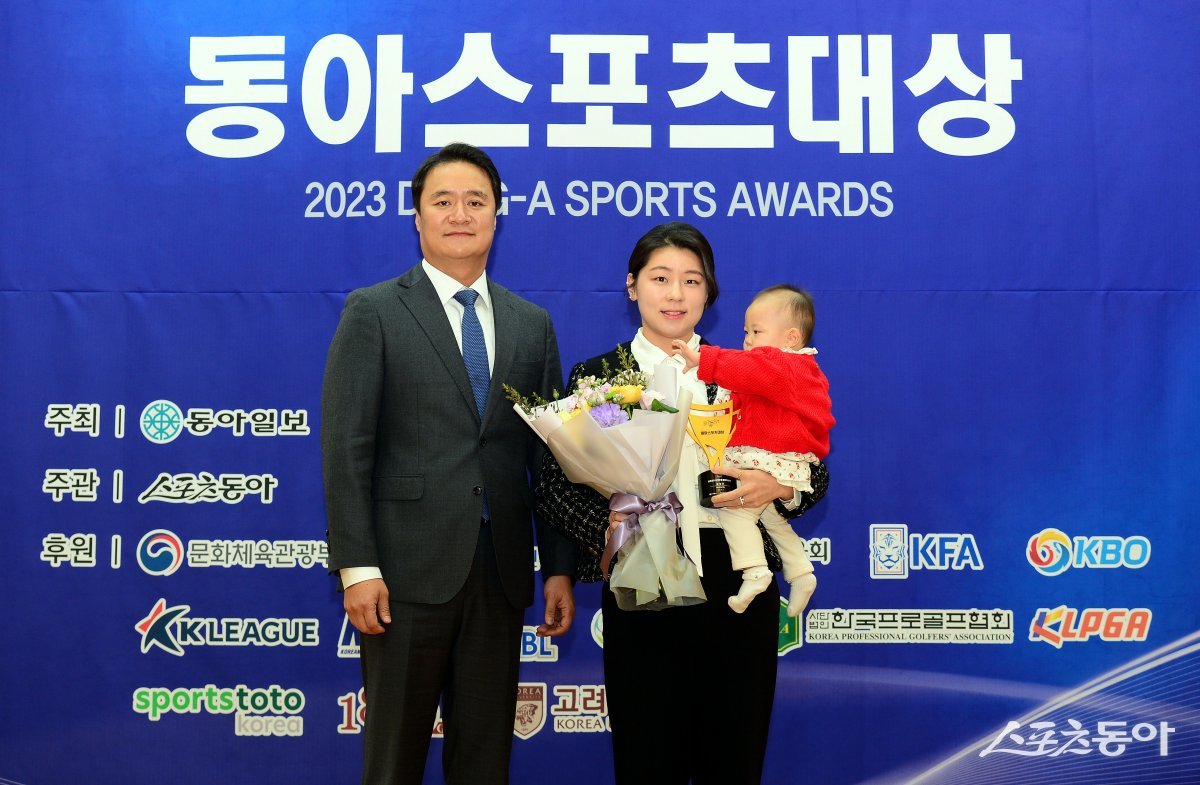 스포츠동아가 동아일보, 채널A와 공동으로 주최하고 국내 5대 프로스포츠(프로야구·프로축구·남녀프로농구·남녀프로배구·남녀프로골프) 종목별로 올 한해를 빛낸 최고의 선수를 선정하는 ‘2023 동아스포츠대상‘ 시상식이 5일 서울 성북구 고려대학교 백주년기념관에서 개최됐다. 남자프로골프 올해의 선수상을 수상한 함정우 프로(하나 금융그룹) 대리수상자 강예린 프로(아내)가 김병준 한국프로골프투어 대표과 기념촬영을 하고 있다.