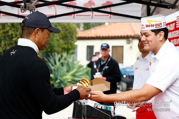 타이거 우즈가 15일(이하 한국시간) 미국 캘리포니아주 퍼시픽 팰리세이즈의 리비에라 컨트리클럽(파71)에서 열린 미국프로골프(PGA) 투어 제네시스 인비테이셔널 프로암 대회에서 8번홀 경기 후 햄버거를 건네받고 있다.