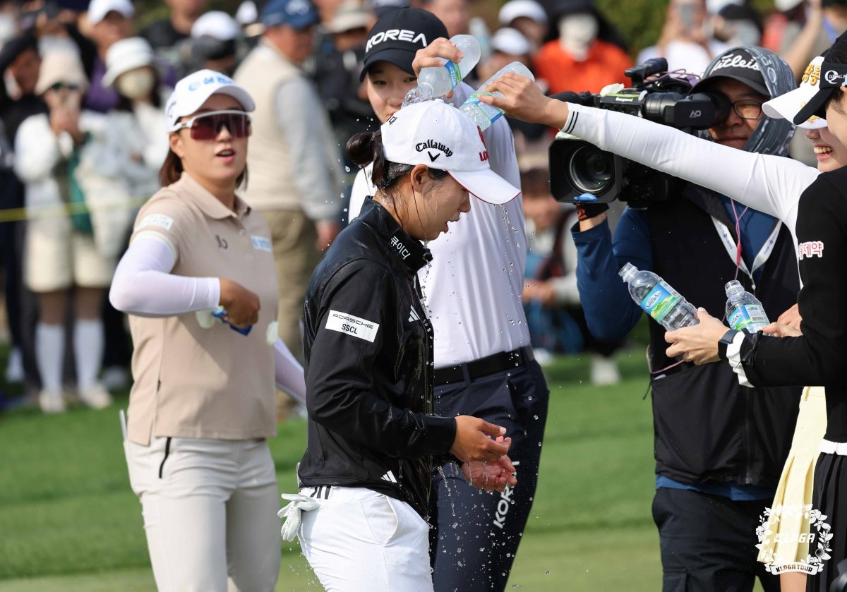 황유민이 7일 제주 서귀포시 테디밸리 골프앤리조트 밸리·테디 코스(파72)서 열린 KLPGA ‘두산건설 위브 챔피언십’에서 우승을 차지한 뒤 동료선수들로부터 축하의 물세례를 받고 있다. 황유민은 시즌 첫 승과 함께 우승상금 2억1600만 원을 거머쥐며 통산 2승의 고지에 올랐다. 사진제공 | KLPGA