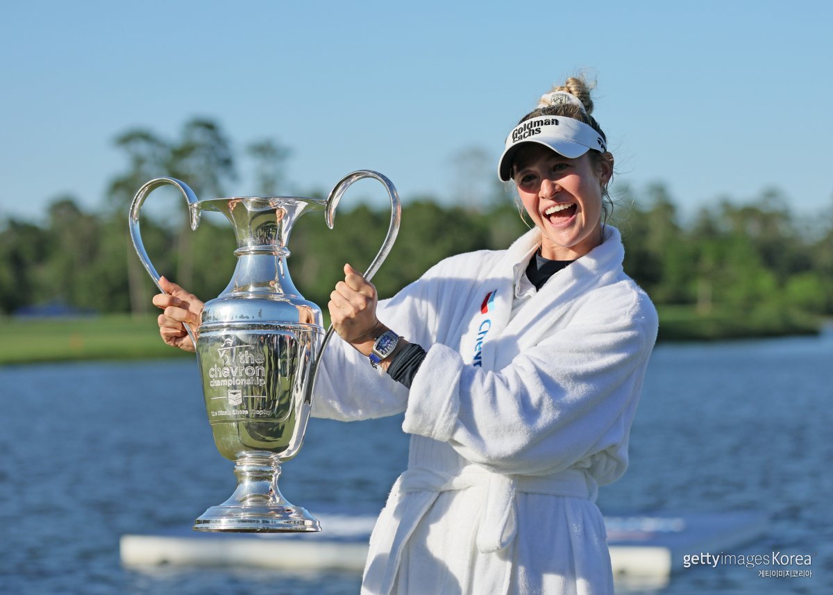 코다는 22일(한국시간) 미국 텍사스주 우들랜즈의 더 클럽 칼턴우즈(파72)에서 열린 LPGA 투어 시즌 첫 메이저 대회 셰브론 챔피언십(총상금 790만 달러·108억 원) 4라운드에서 버디 5개와 보기 2개로 3타를 줄였다. 최종합계 13언더파 275타를 기록해 2위 마야 스타르크(스웨덴·11언더파)를 2타 차로 따돌리고 우승 상금 120만 달러(16억5000만 원)를 획득했다. 2021년 6월 KPMG 여자 PGA 챔피언십 이후 개인 두 번째 메이저 우승이자 통산 13승을 수확한 그는 이 대회 전통에 따라 18번 홀 그린 주변 호수에 뛰어드는 ‘호수 세리머니’를 하며 우승 기쁨을 만끽했다.
