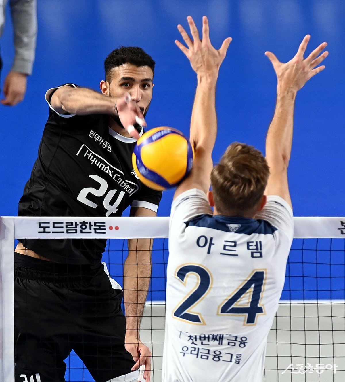12일 충남 천안유관순체육관체육관에서 ‘2023-2024 도드람 V리그’ 천안 현대캐피탈과 서울 우리카드 남자부 경기가 열렸다. 현대캐피탈 아흐메드가 우리카드 블로커를 피해 스파이크를 날리고 있다.