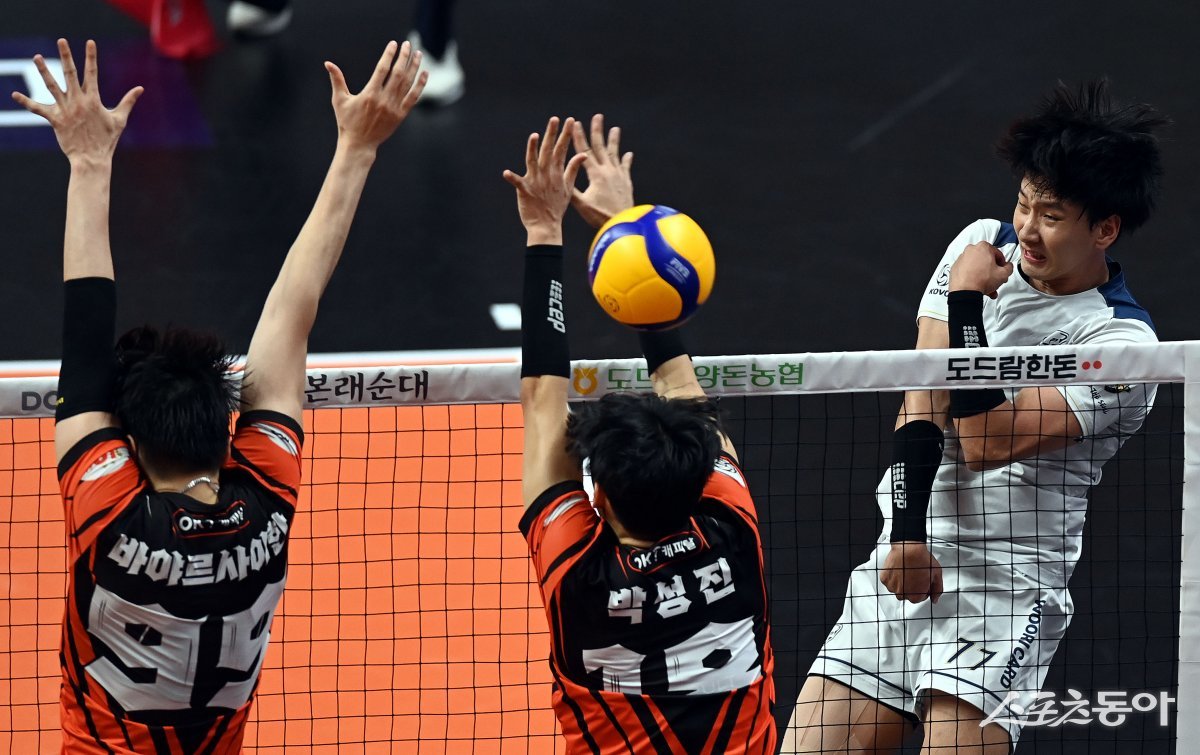 25일 경기도 안산 상록수체육관에서 ‘2023-2024 도드람 V리그’ 안산 OK금융그룹과 서울 우리카드의 남자부 플레이오프 경기가 열렸다. 우리카드 송명근이 OK금웅그룹 블로커를 피해 스파이크를 날리고 있다.