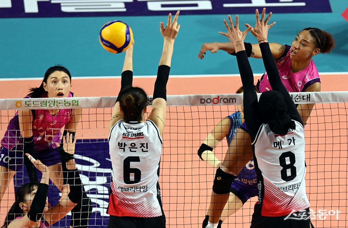 26일 인천 삼산월드체육관에서 ‘2023-2024 도드람 V리그’ 인천 흥국생명과 대전 정관장의 여자부 플레이오프 경기가 열렸다. 흥국생명 레이나가 정관장 블로커를 피해 스파이크를 날리고 있다.
