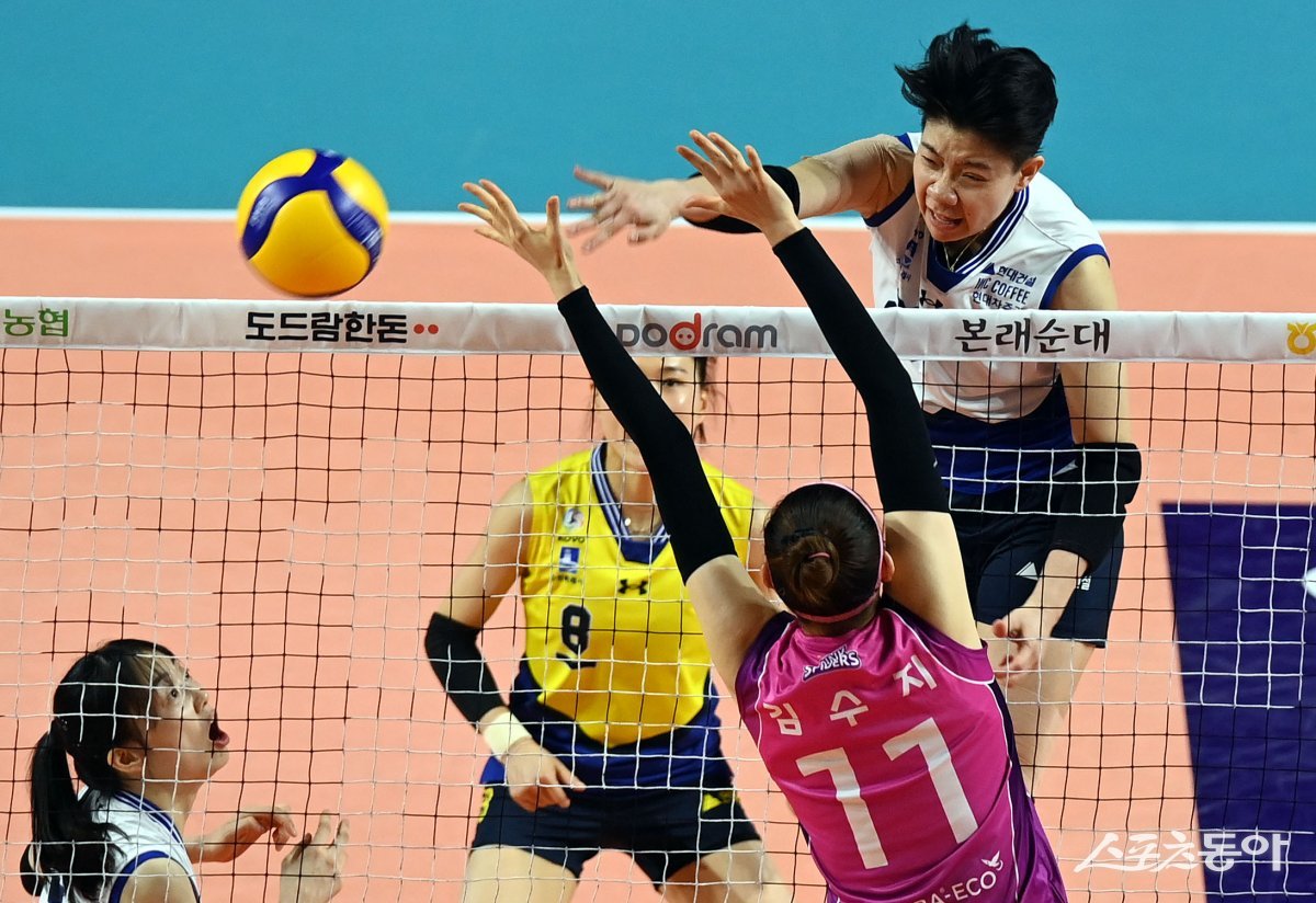1일 인천 삼선월드체육관에서 ‘2023-2024 도드람 V리그’ 인천 흥국생명과 수원 현대건설의 여자부 챔피언결정전 3차전 경기가 열렸다. 현대건설 위파위가 흥국생명 블로커를 피해 공격을 펼치고 있다.