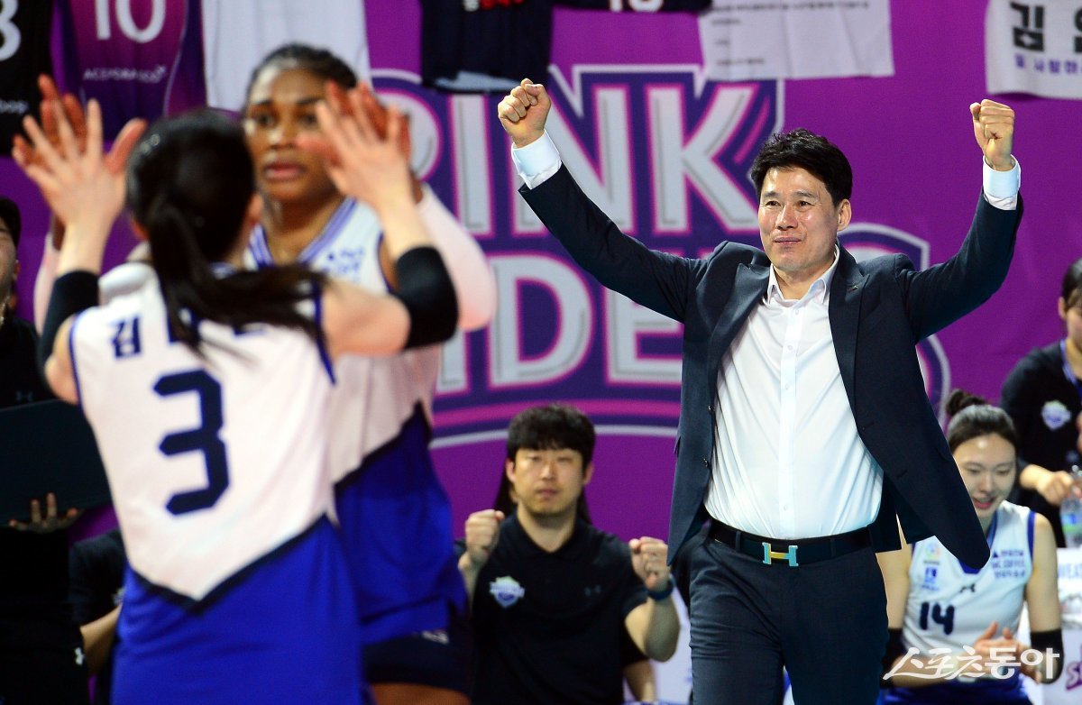 1일 인천 삼선월드체육관에서 ‘2023-2024 도드람 V리그’ 인천 흥국생명과 수원 현대건설의 여자부 챔피언결정전 3차전 경기가 열렸다. 현대건설 강성형 감독이 득점에 환호하고 있다. 인천 | 김민성 기자 marineboy@donga.com