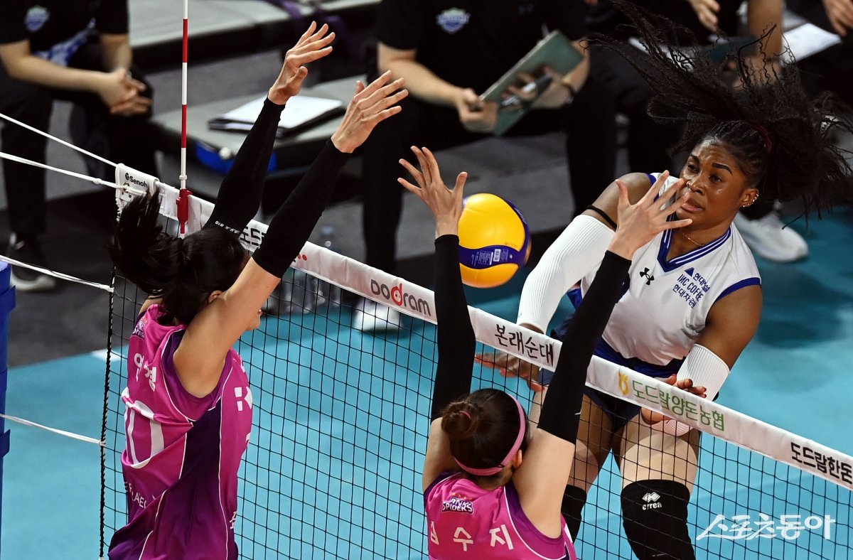 1일 인천 삼선월드체육관에서 ‘2023-2024 도드람 V리그’ 인천 흥국생명과 수원 현대건설의 여자부 챔피언결정전 3차전 경기가 열렸다. 현대건설 모마가 흥국생명 블로커를 피해 스파이크를 날리고 있다.