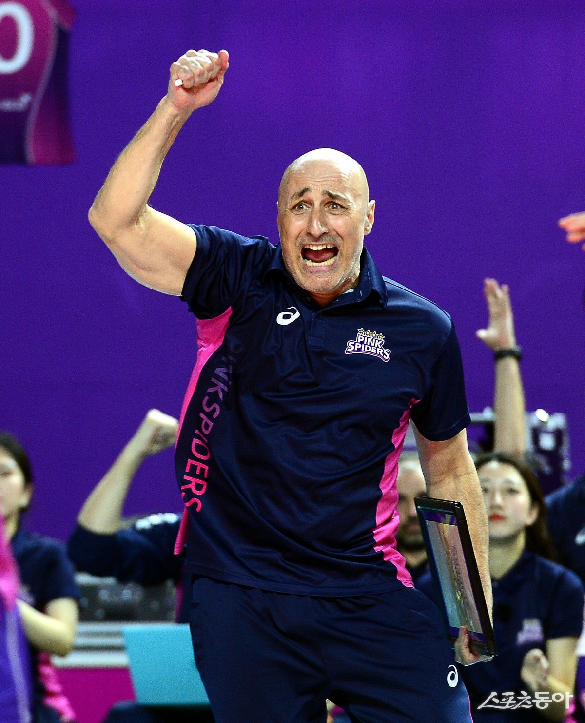 1일 인천 삼선월드체육관에서 ‘2023-2024 도드람 V리그’ 인천 흥국생명과 수원 현대건설의 여자부 챔피언결정전 3차전 경기가 열렸다. 흥국생명 아본단자 감독이 환호하고 있다. 인천 | 김민성 기자 marineboy@donga.com