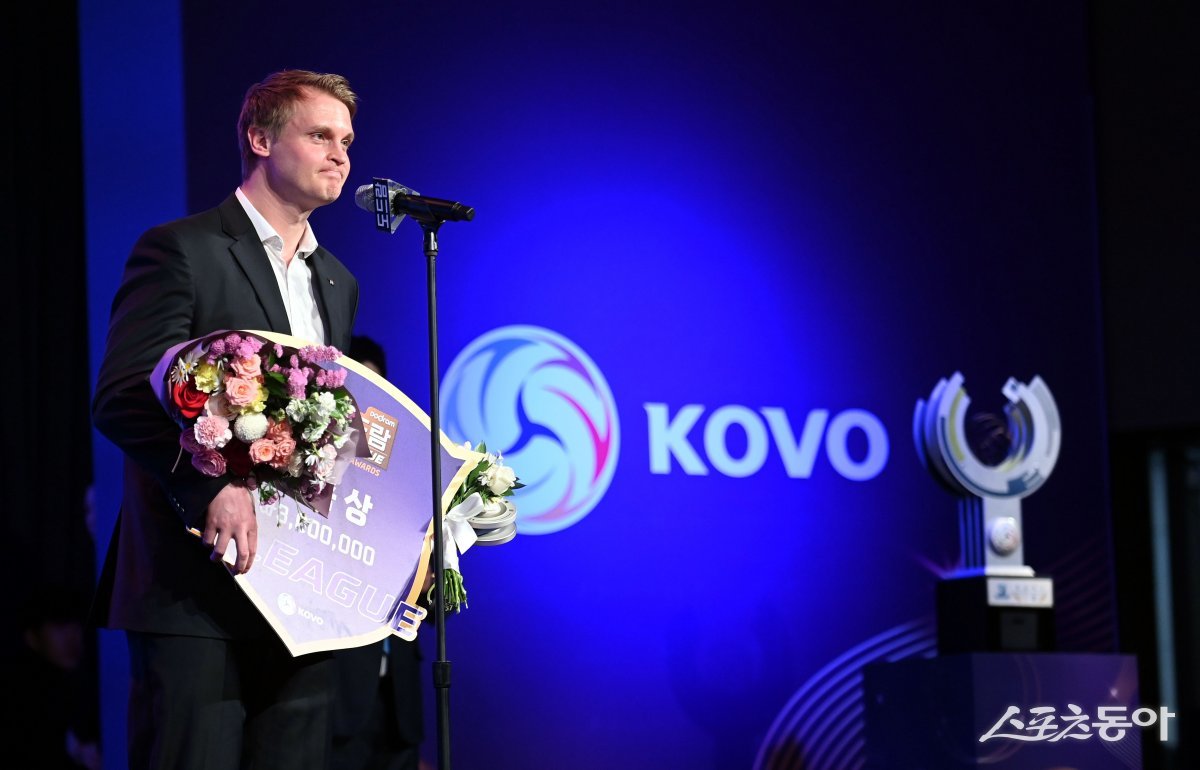 ‘도드람 2023~2024 V리그’ 시상식이 8일 서울 서초구 더케이 호텔 서울에서 열렸다. 감독상을 수상한 남자부 대한항공 토미 틸리카이넨 감독이 소감을 말하고 있다.