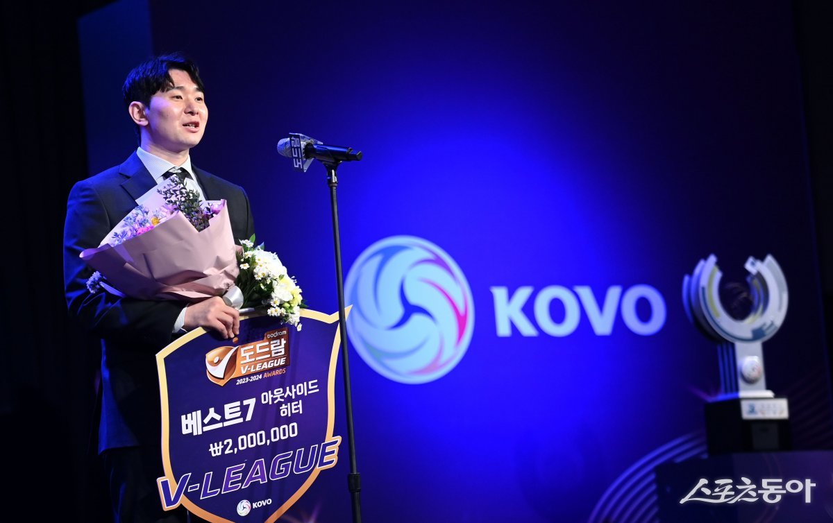 ‘도드람 2023~2024 V리그’ 시상식이 8일 서울 서초구 더케이 호텔 서울에서 열렸다. 남자부 베스트7에 선정된 아웃사이드히터 삼성화재 요스바니를 대신해 노재욱이 소감을 말하고 있다.
