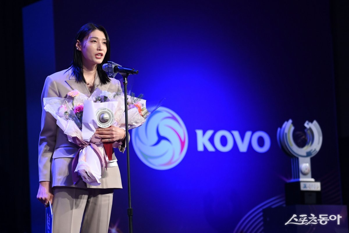 ‘도드람 2023~2024 V리그’ 시상식이 8일 서울 서초구 더케이 호텔 서울에서 열렸다. 여자부 베스트7에 선정된 아웃사이드히터 흥국생명 김연경이 소감을 말하고 있다.