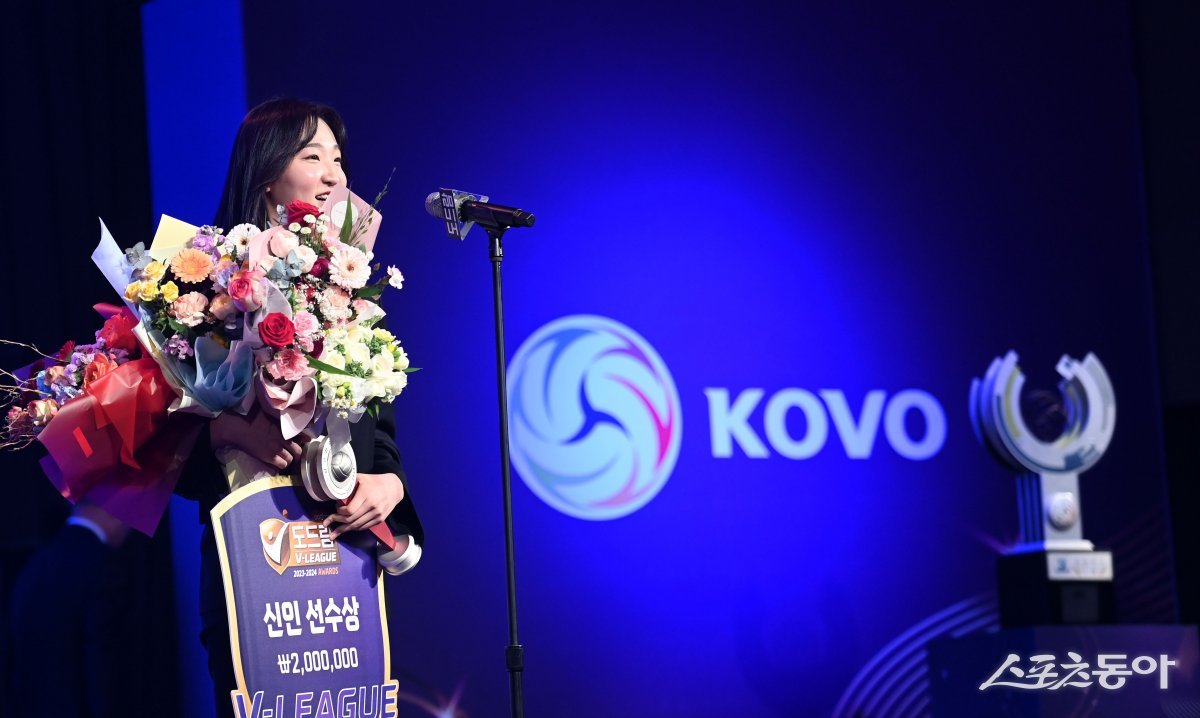 ‘도드람 2023~2024 V리그’ 시상식이 8일 서울 서초구 더케이 호텔 서울에서 열렸다. 여자부 신인선수상을 수상한 한국도로공사 김세빈이 소감을 말하고 있다.