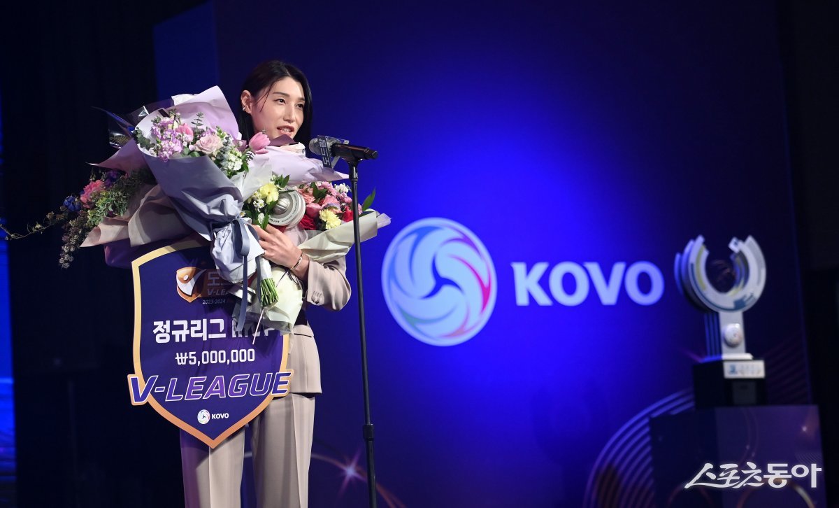 ‘도드람 2023~2024 V리그’ 시상식이 8일 서울 서초구 더케이 호텔 서울에서 열렸다. 여자부 정규리그 MVP에 선정된 흥국생명 김연경이 소감을 말하고 있다.