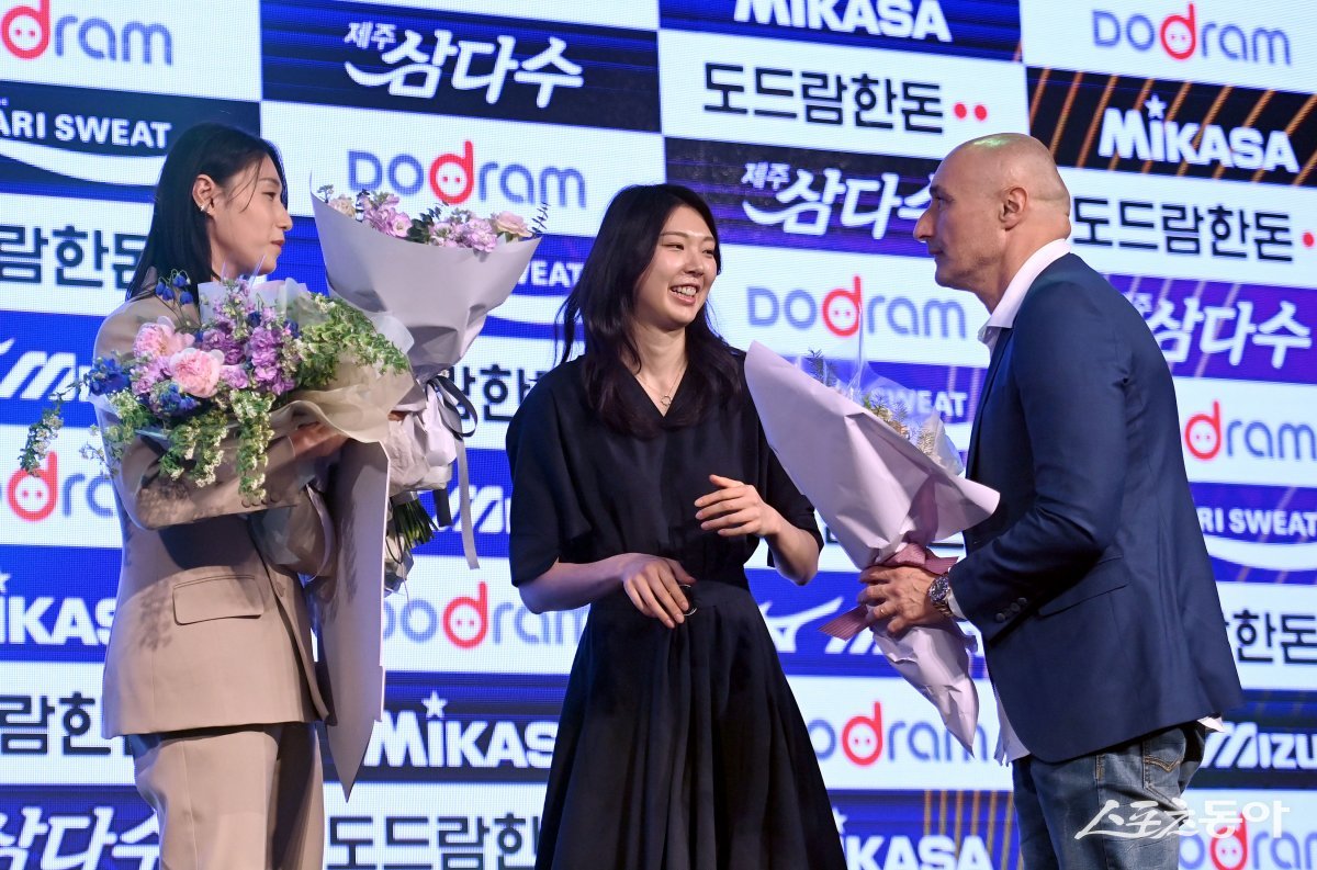 ‘도드람 2023~2024 V리그’ 시상식이 8일 서울 서초구 더케이 호텔 서울에서 열렸다. 여자부 정규리그 MVP에 선정된 흥국생명 김연경이 양효진과 아본단자 감독에게 꽃다발을 받고 있다.