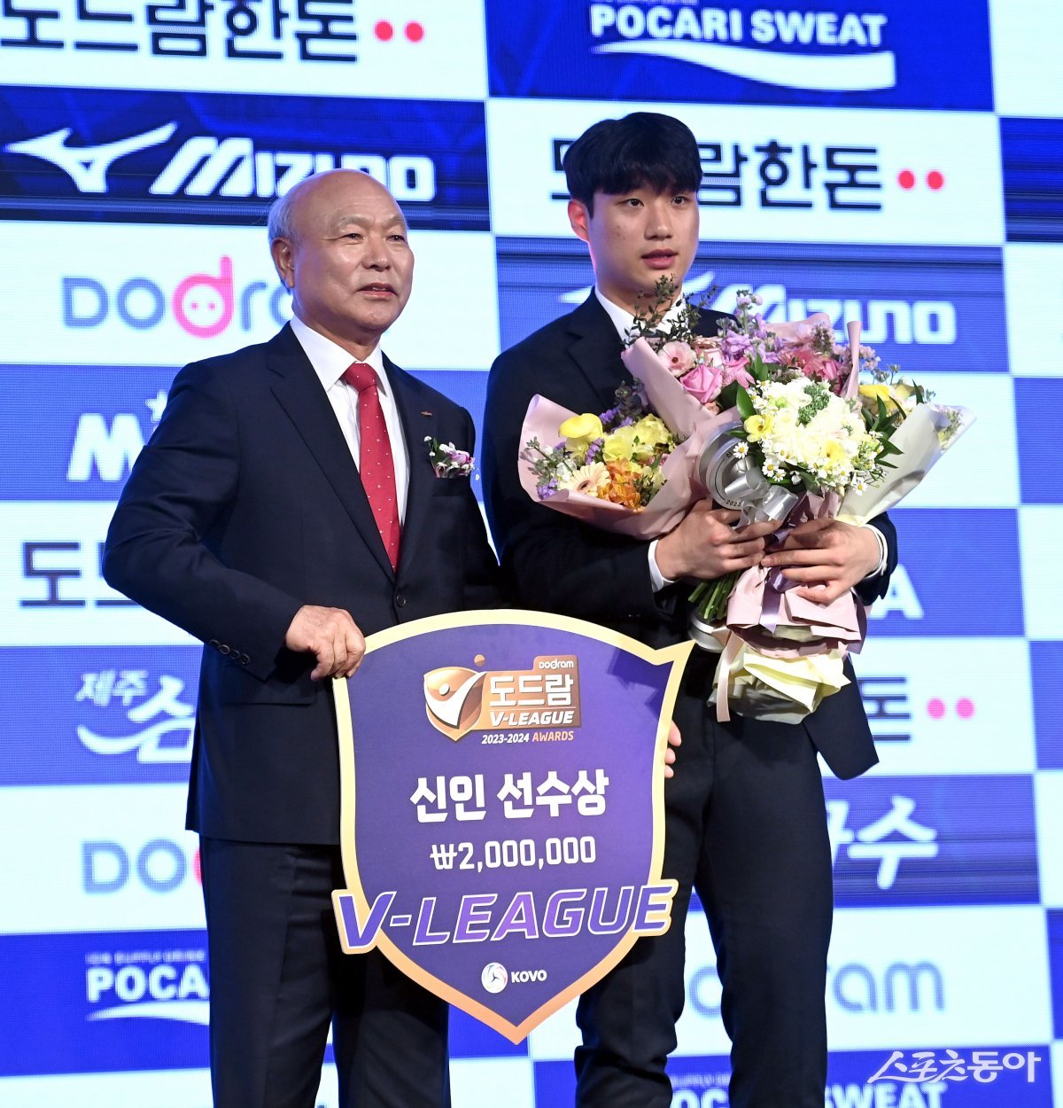 ‘도드람 2023~2024 V리그’ 시상식이 8일 서울 서초구 더케이 호텔 서울에서 열렸다. 남자부 신인선수상을 수상한 삼성화재 이재현이 박광욱 도드람양돈농협 조합장과 기념촬영을 하고 있다.