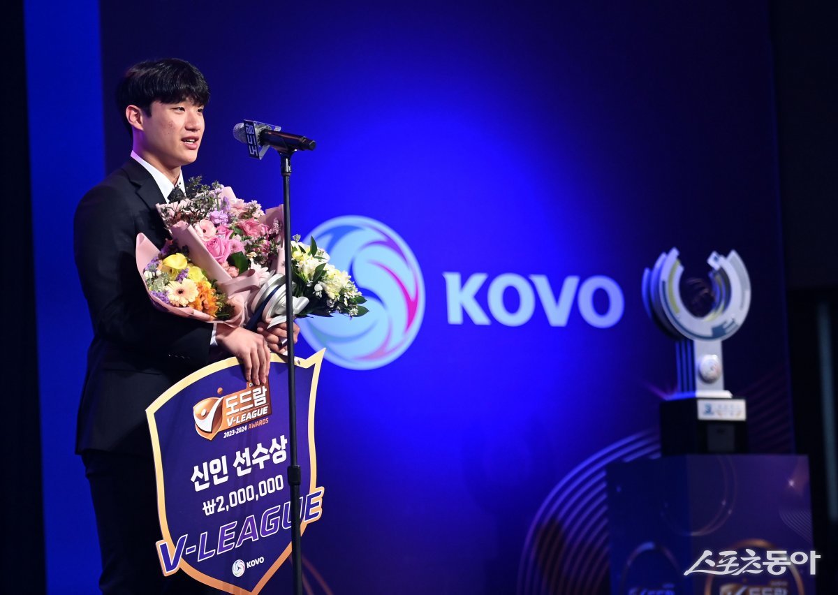 ‘도드람 2023~2024 V리그’ 시상식이 8일 서울 서초구 더케이 호텔 서울에서 열렸다. 남자부 신인선수상을 수상한 삼성화재 이재현이 소감을 말하고 있다.