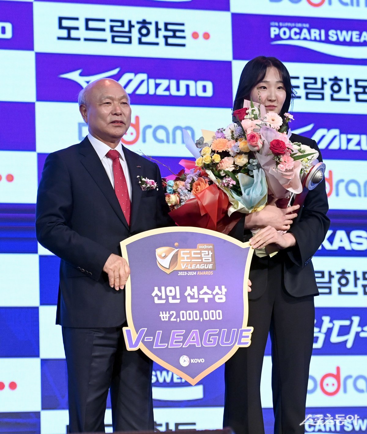 ‘도드람 2023~2024 V리그’ 시상식이 8일 서울 서초구 더케이 호텔 서울에서 열렸다. 여자부 신인선수상을 수상한 한국도로공사 김세빈이 박광욱 도드람양돈농협 조합장과 기념촬영을 하고 있다.