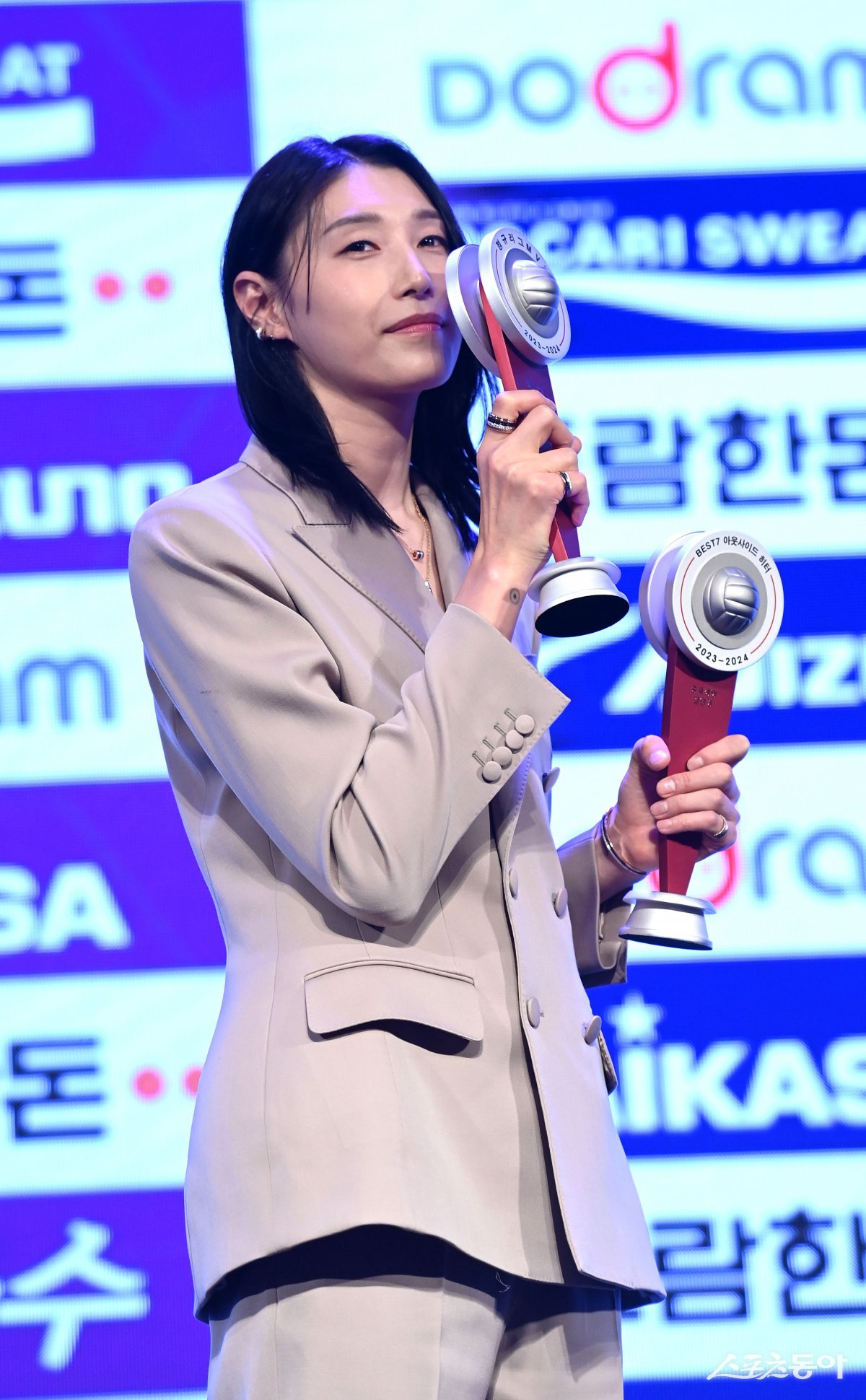 ‘도드람 2023~2024 V리그’ 시상식이 8일 서울 서초구 더케이 호텔 서울에서 열렸다. 여자부 정규리그 MVP에 선정된 흥국생명 김연경이 기념촬영을 하고 있다.