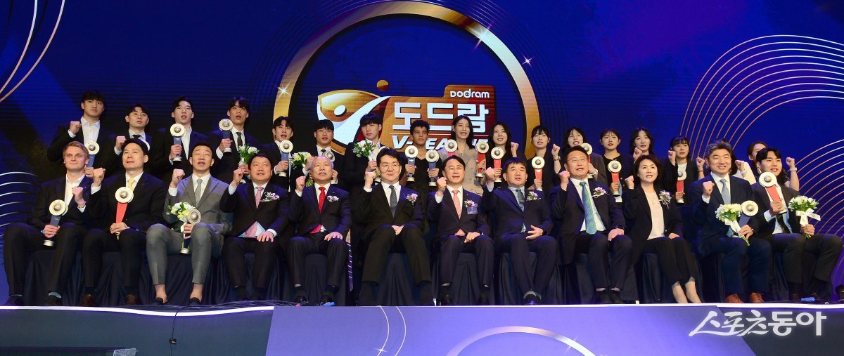 ‘도드람 2023~2024 V리그’ 시상식이 8일 서울 서초구 더케이 호텔 서울에서 열렸다. 수상자들이 기념촬영을 하고 있다.