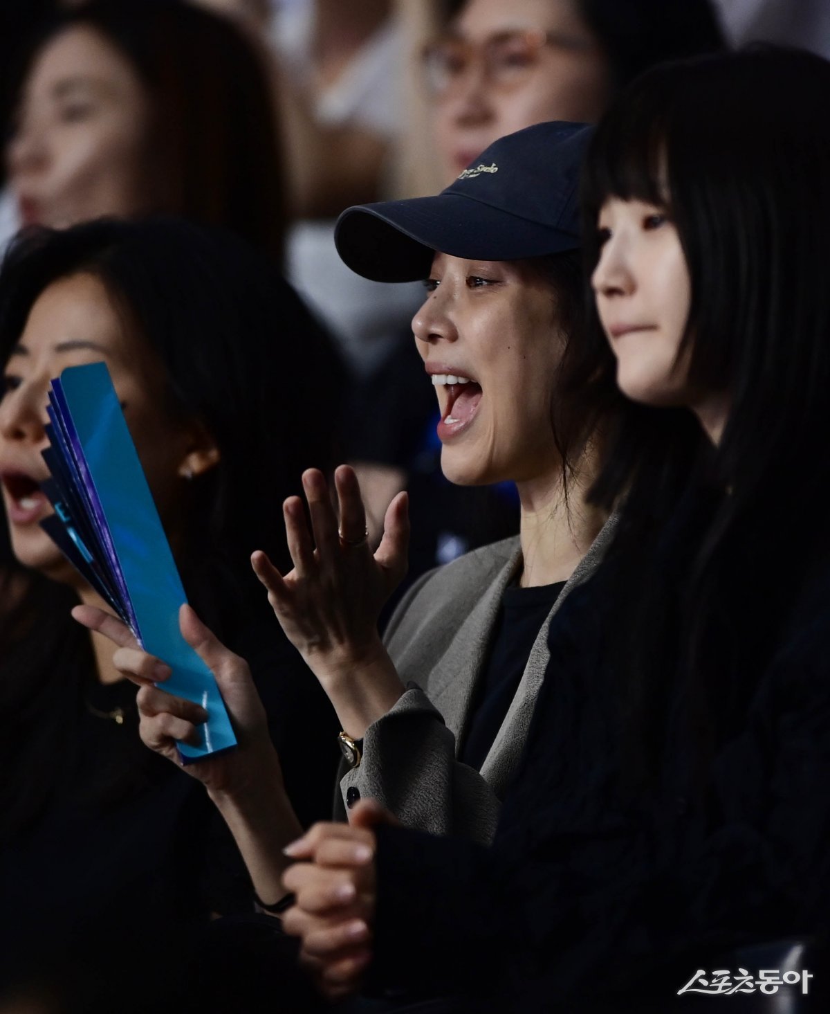8일 서울 잠실실내체육관에서 열린 ‘김연경 초청 세계 여자배구 올스타전(KYK Invitational 2024)‘ 팀 대한민국과 팀 코리아의 경기에서 배우 려원이 응원을 하고 있다.