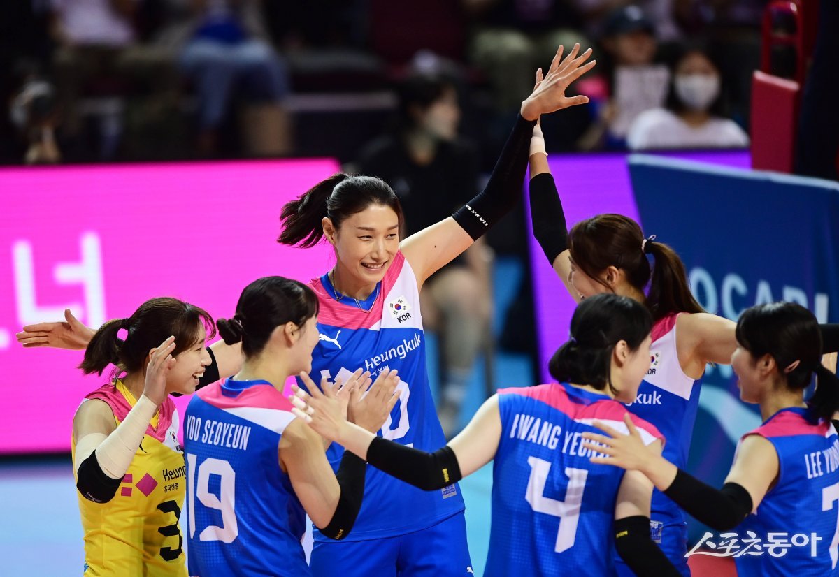 8일 서울 잠실실내체육관에서 열린 ‘김연경 초청 세계 여자배구 올스타전(KYK Invitational 2024)‘ 팀 대한민국과 팀 코리아의 경기에서 득점에 성공한 팀 대한민국 김연경이 동료들과 기쁨을 나누고 있다.