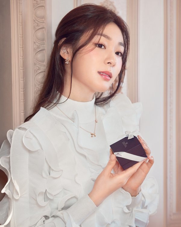 공개된 사진에는 리본 귀걸이와 목걸이로 화이트 프릴 블라우스에 포인트를 준 김연아의 모습이 담겨 있다.