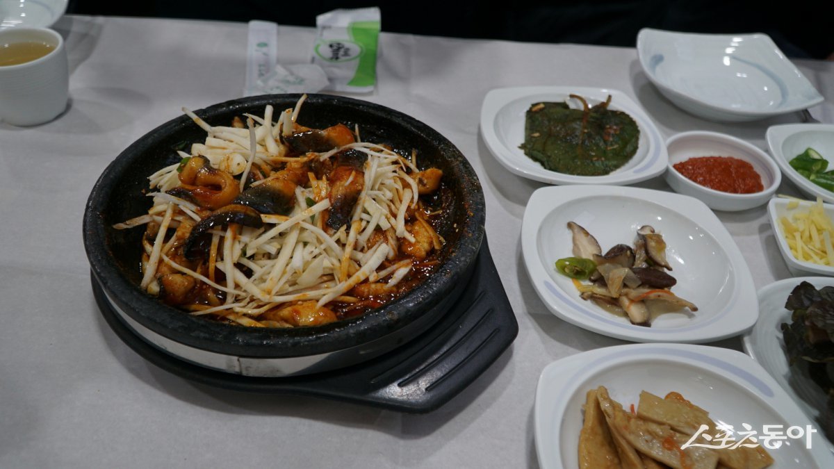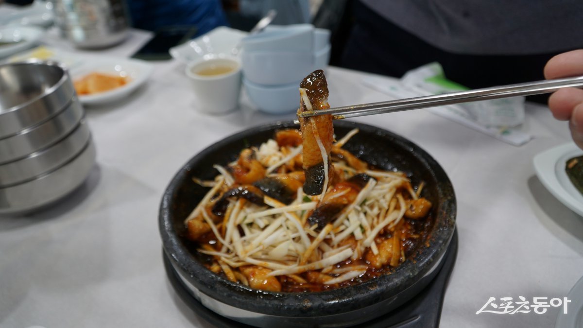 식정동 더덕장어구이 거리의 터줏대감격인 청룡가의 더덕장어구이. 고추장을 베이스로 하는 소스의 장어를 돌판에 볶듯 굽고 그 위에 생 더덕을 한가득 썰어 덮어준다 남원|김재범 기자 oldfield@donga.com