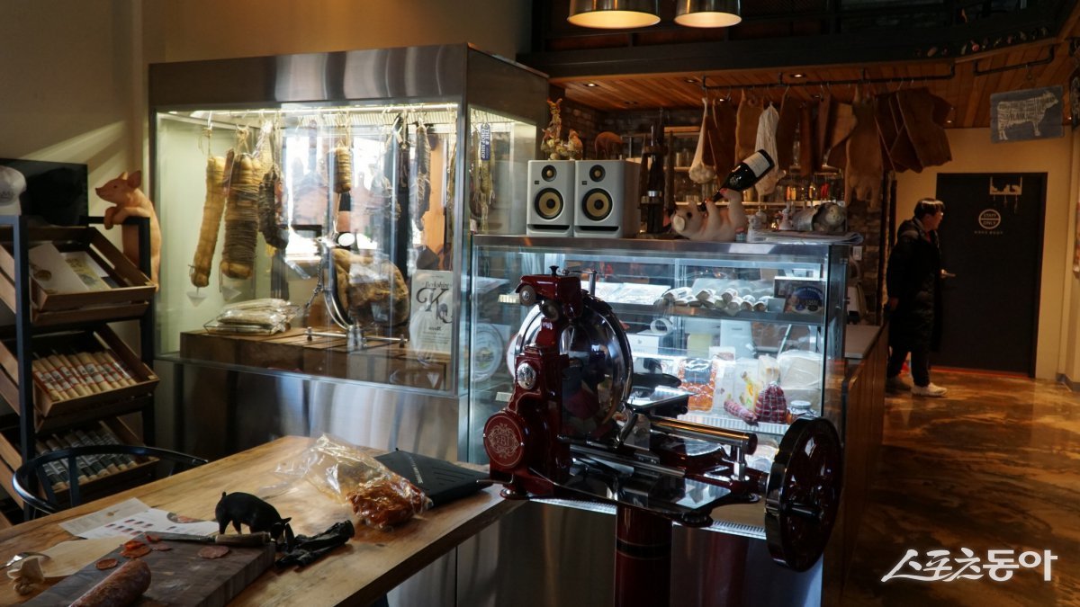 유리 진열장 안에서 숙성중인 각종 샤퀴테리가 눈길을 끄는 ‘더 찹샵’의 매장 내부. 넓지는 않지만 스페인이나 프랑스 지방의 오랜 향토 샤퀴테리아를 연상케 하는 이국적인 분위기가 인상적이다 남원|김재범 기자 oldfield@donga.com