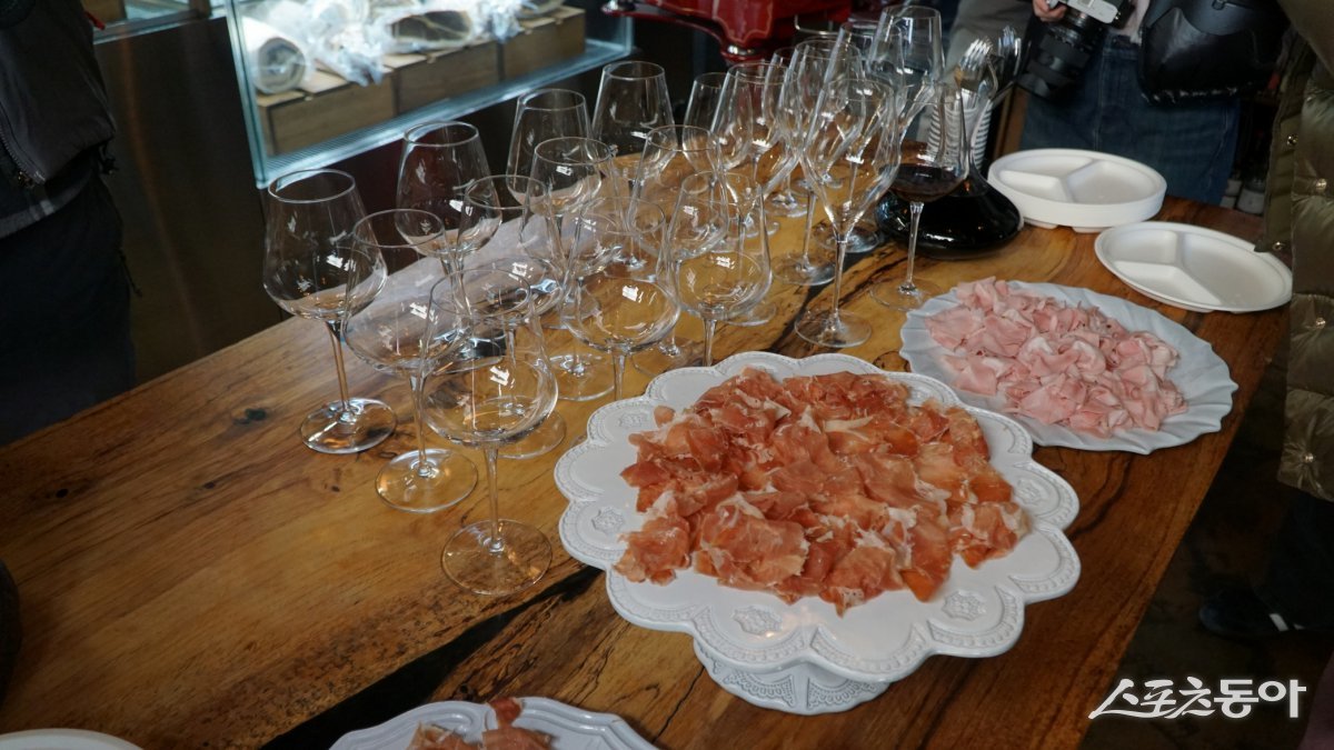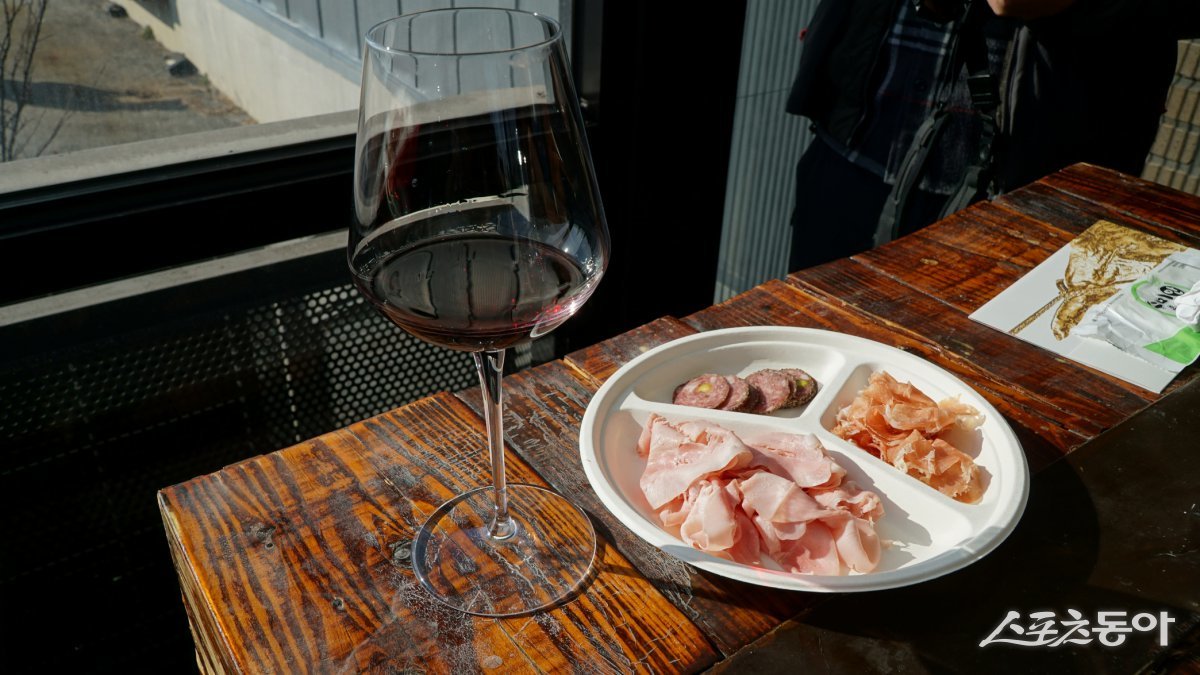 산뜻한 스페인 와인 한 잔과 함께 맛을 본 ‘더 찹샵’의 샤퀴테리들. 왼쪽의 분홍빛 육질이 잠봉이고, 위의 동그란 것은 살라미, 그 아래는 하몽이다 남원|김재범 기자 oldfield@donga.com