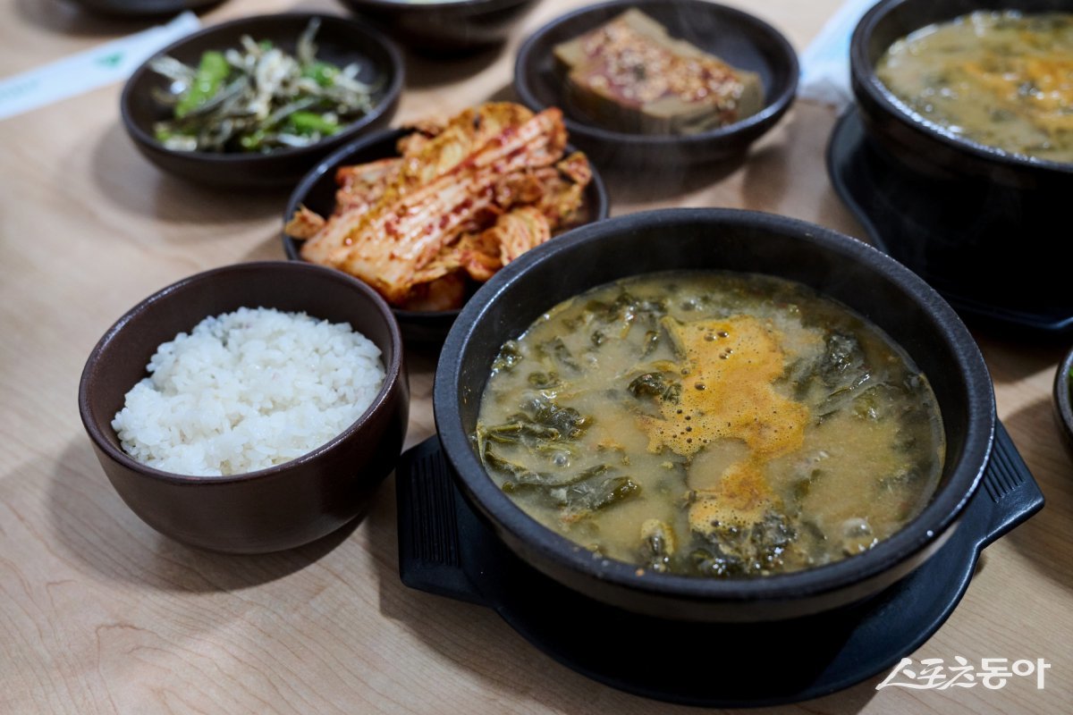 남원 ‘맑은 뜰’의 다슬기 해장국. 국내산 다슬기를 듬뿍 넣은 된장 육수에 아욱과 청양고추로 구수함과 칼칼한 맛을 더했다 남원|김재범 기자 oldfield@donga.com