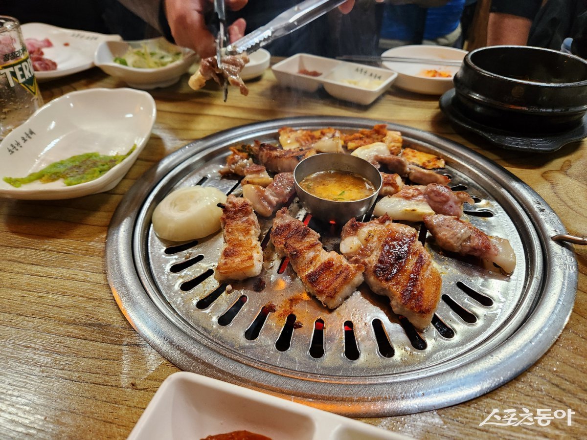 먹음직스럽게 구워진 남원 ‘소문난 오돌뼈’의 흑돼지 덜미살. 씹는 맛과 진한 풍미가 좋아 알고 찾는 손님이 많은 인기 부위다 남원|김재범 기자 oldfield@donga.com