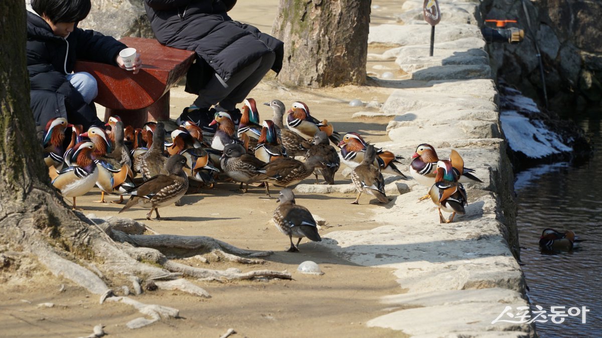 광한루원 연못 연지에 있는 원앙 무리에게 먹이를 주는 방문객. 원앙이 부부의 금슬을 상징해 광한루원의 연못에는 원앙떼가 많다 남원|김재범 기자 oldfield@donga.com