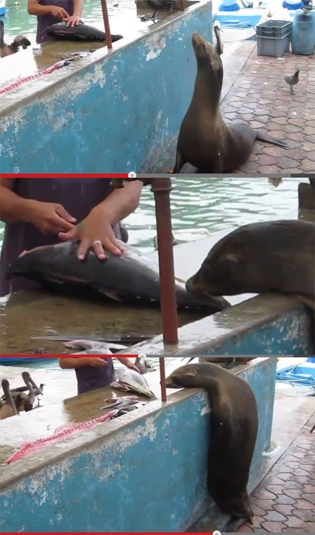 공개된 ‘장 보는 바다사자 포착’ 영상에는 에콰도르 갈라파고스 제도의 한 수산시장에서 바다사자 한 마리와 펠리컨들이 물고기를 손질하는 상인에게 애처로운 눈빛을 보내는 모습이 담겨있어 귀여움을 자아낸다.