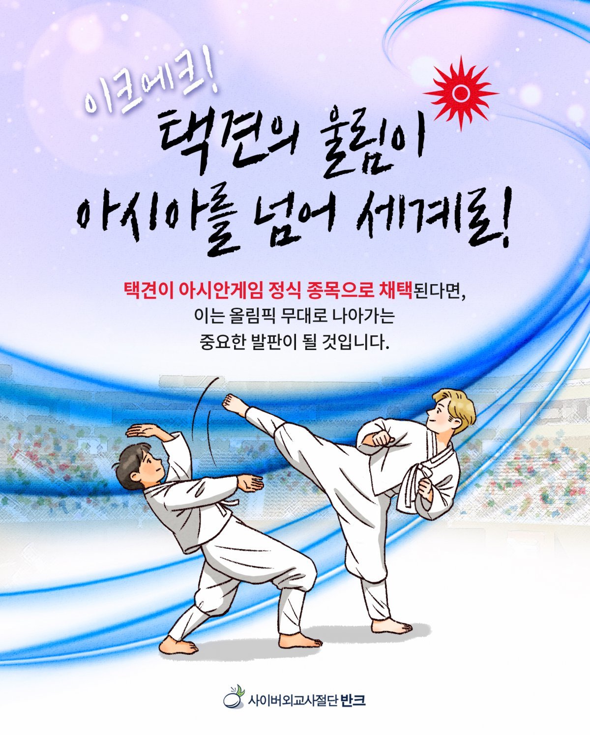 사이버외교사절단 반크는 택견의 아시안게임 정식 종목 채택을 목표로 캠페인을 전개한다. 2011년 유네스코 인류무형문화유산으로 등재된 택견은 역사적·문화적 가치를 세계적으로 인정받은 한국 전통 무예다. 반크는 이번 캠페인을 통해 택견을 글로벌 스포츠로 성장시키고, 이를 통해 한국 문화를 세계에 알리는 중요한 전환점이 될 것으로 기대하고 있다.